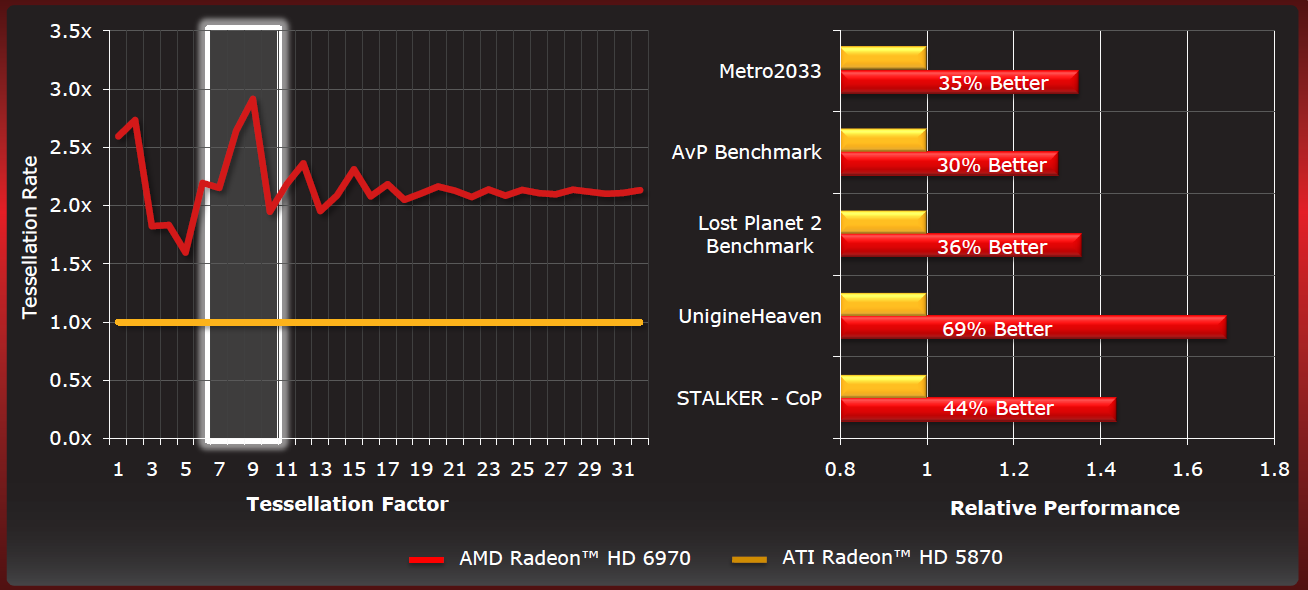 Ricordiamo brevemente le novità introdotte nella settima generazione che hanno portato a un incremento delle performance radicale rispetto alla serie HD 5800. Il Tessellator permette di generare per mezzo dell’interpolazione un numero elevato di poligoni su tutti gli oggetti che si trovano in primo piano, incrementando in questo modo la qualità degli oggetti renderizzati nei video giochi. Nel caso delle HD5000 si assisteva però a un rilevante calo delle prestazioni al momento dell’attivazione del Tessellator, che sottrae inevitabilmente risorse ai SIMD per effettuare le sue elaborazioni. Con il nuovo Tessellator introdotto nella serie HD6000, AMD è riuscita a incrementare le performance della hd6970 fino a 3 volte rispetto alla HD5870. Ciò è dovuto in parte a una migliore gestione dei thread attivi nella gpu, ma principalmente a un accorgimento che limita il fenomeno dell’overshading.