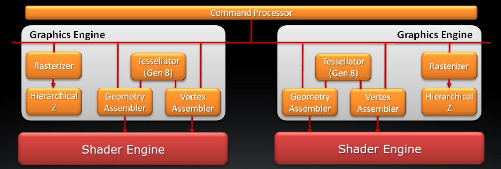 Grazie all’utilizzo del dual engine, tutte le funzioni sono replicate: Geometry e Vertex Assembler ma anche e soprattutto le unità di Tessellation giunte all’ottava generazione. Abbiamo già visto i miglioramenti introdotti nella precedente generazione, quella utilizzata nelle GPU Barts. Tale unità è stata ulteriormente migliorata per permettere un aumento di prestazioni negli scenari più pesanti per il Tessellator.