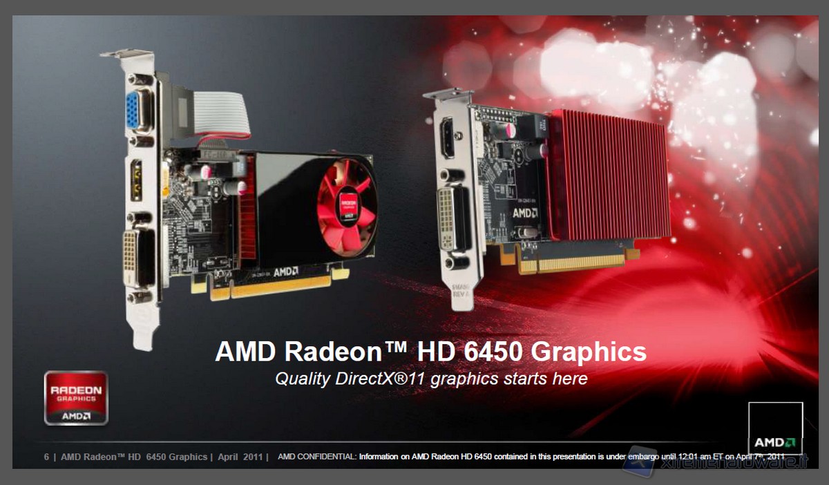 AMD_Radeon_HD_6450_logo Nei giorni scorsi AMD ha fatto esordire in anteprima la Radeon HD 6450, una scheda grafica dedicata alla fascia entry level del mercato consumer. Nella precedente recensione abbiamo avuto modo di analizzare caratteristiche e funzionalità, adesso andremo ad analizzarne le prestazioni velocistiche principalmente in ambito gaming.