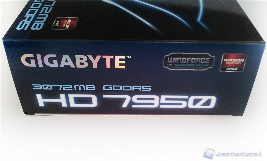 La GIGABYTE HD 7950 viene commercializzata all'interno di una confezione in cartone dalle dimensioni di 400x235x90 mm e caratterizzata dalla colorazione blu tipica della casa produttrice.