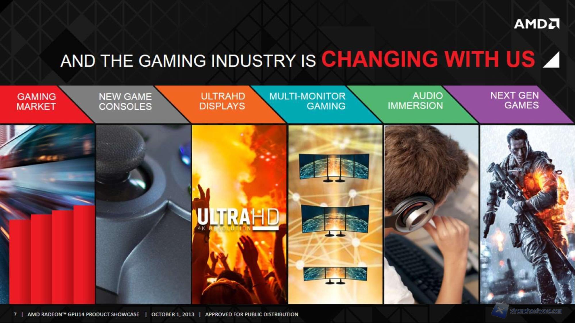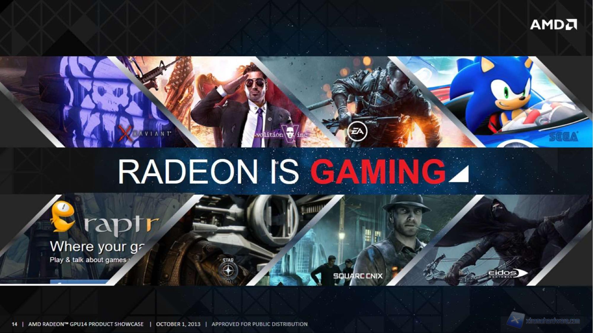 Le novità invece nel puro campo hardware ludico riguardano, come accennato, l'introduzione di una nuova serie di GPU card che appartengono a due serie distinte, R7 e R9 con numerosi modelli per tutti i gusti. La serie R9 è pensata per coloro che chiedono per il settore gaming il meglio; mentre la serie R7 è pensata per dare al consumatore un po' tutto a 360° e non soltanto quindi nel settore gaming.