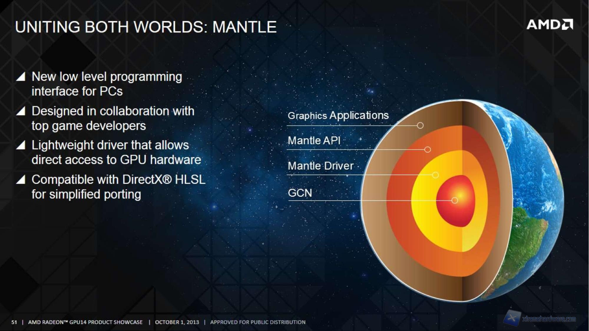 Novità davvero interessante è Mantle, che altro non è che un modello di programmazione grafico totalmente differente rispetto al passato e nuovo; questa nuova metodologia usufruisce della potenza elaborativa delle attuali GPU ed in particolare delle architetture AMD Graphics Core Next (GCN). Mantle nasce con la collaborazione di alcune software house come le conosciutissime DICE e EA che tramite alcune ottimizzazioni lato driver e API, permetteranno di utilizzare questi modelli sia in ambito PC sia in ambito Console. Questo a conti fatti permetterà un'ottimizzazione e sviluppo dell'hardware in misura decisamente maggiore rispetto a ciò che avviene attualmente, sfruttando i benefici di questa ottimizzazione del codice sia per il mondo PC sia per quello Console.
