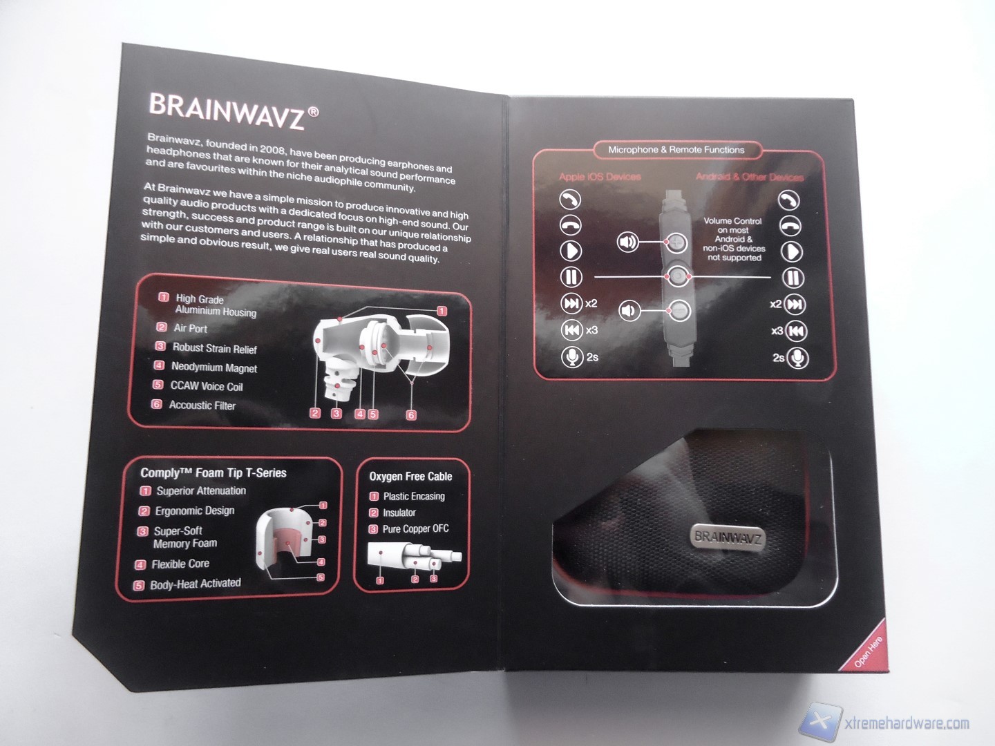 La confezione è anche dotata di un’apertura a libro che ci permetterà di leggere la storia dell’azienda, di osservare come è costruito il prodotto e come utilizzare il controller sul filo. In basso a destra è presente una piccola finestra che ci permette di vedere la custodia in tessuto in cui sono contenute le cuffie.