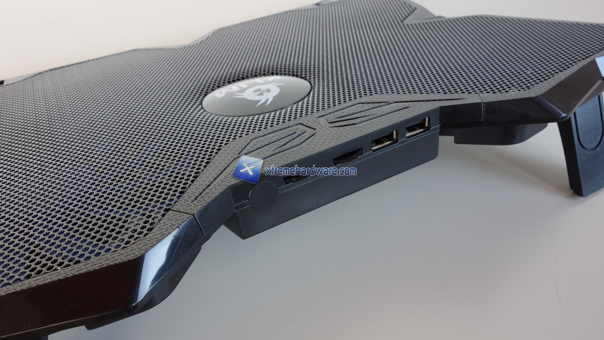 Questa base di raffreddamento viene proposta in colorazione nero-blu, nero-rosso o rosso-blu; può ospitare notebook fino a 19", tuttavia i portatili superiori ai 17" non rientreranno completamente sul piano di appoggio ma il produttore garantisce una stabilità tale da permetterne ugualmente l'utilizzo. A livello costruttivo questa base di raffrettamento presenta uno scheletro totalmente in plastica dalle dimensioni di 408 x 278 x 29 mm e dal peso di 850 grammi; la zona in cui viene appoggiato il notebook è invece realizzata con una griglia in mesh. La plastica è di discreta qualità, sufficientemente rigida per conferire una buona solidità alla struttura. Sul retro sono chiaramente presenti i piedini gommati, ovviamente la zona posteriore presenta due levette simili a quelle delle tastiere che permettono di regolare l'inclinazione della base; è un peccato che l'angolo di appoggio non sia regolabile finemente (in pratica o si tiene la base parallela al piano di appoggio o inclinata di un angolo fisso). Sempre sul retro troviamo un piccolo vano utile per riporre il cavetto USB.