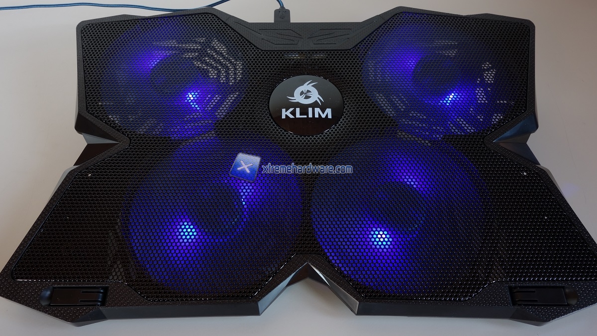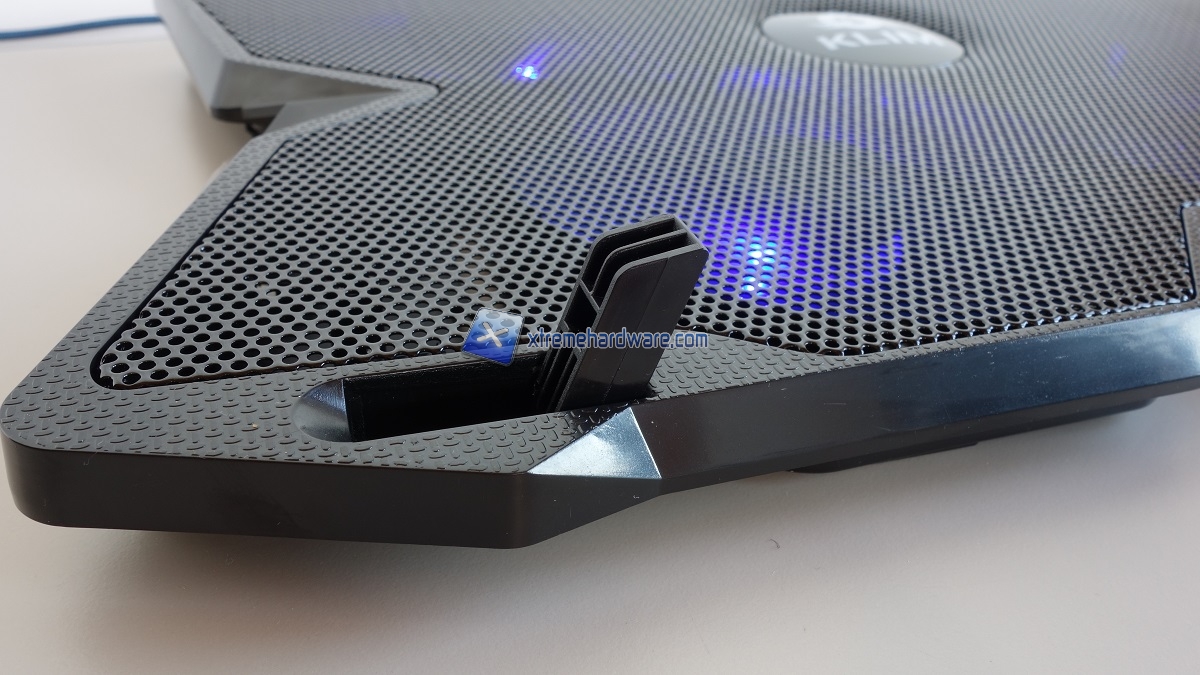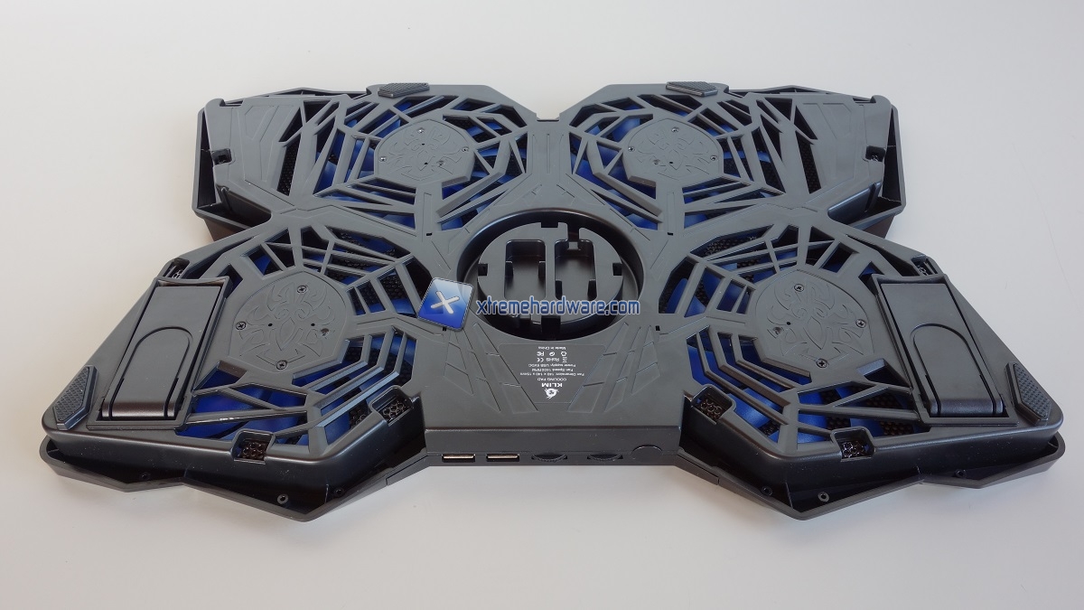 La parte superiore, caratterizzata dal logo Klim e dalla griglia in mesh, presenta anche due gancetti estraibili utili ad evitare un eventuale scivolamento del notebook verso il basso. Le porte USB, di tipo normale e non 3.0, sono situate nella zona posteriore, ce ne sono due perchè una viene utilizzata per l'alimentazione mentre l'altra funge da "hub" USB; in questo modo la porta che viene occupata sul notebook viene recuperata tramite la basetta di raffrettamento. A fianco delle porte USB abbiamo anche le due rotelline che servono a regolare con continuità la rotazione delle ventole, a due a due. Ogni ventola infine è dotata di led blu che si accendono automaticamente all'avviamento delle ventole e non possono essere disattivati.