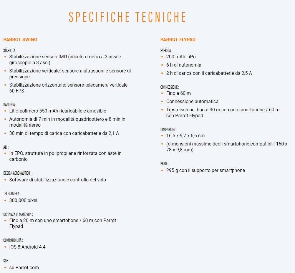 Procediamo dunque ad elencare brevemente le caratteristiche del Mini Drone Parrot Swing comprendenti anche quelle del controller Parrot Flypad (venduto anche come accessorio):
