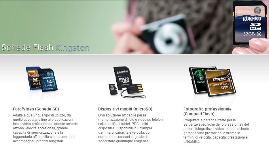 Il mercato tecnologico si sta sempre più spostando verso la mobilità. Negli ultimi mesi abbiamo assistito ad una crescente offerta di prodotti che sono volti a soddisfare proprio questo nuovo bisogno degli utenti. La presenza di nuovi smartphone, netbook, tablet ed altri dispositivi sempre più performanti, richiede sempre più spesso l'esigenza di espandere la memoria in dotazione, che diviene frequentemente un limite nell'archiviazione dati. Per sopperire quindi ad una dotazione di memoria limitata in questi dispositivi l'utente cerca di ampliare le capacità di archiviazione di questi acquistando memorie esterne. Sempre più spesso i produttori propongono agli utenti vari formati proprio per soddisfare le più varie esigenze. Infatti nel mercato esistono diverse tipologie per queste memorie, per lo più di tipo flash, che soddisfano i vari standard richiesti dai vari dispositivi. Kingston non fa eccezione ed ha nel proprio catalogo numerose offerte per tutte le esigenze.