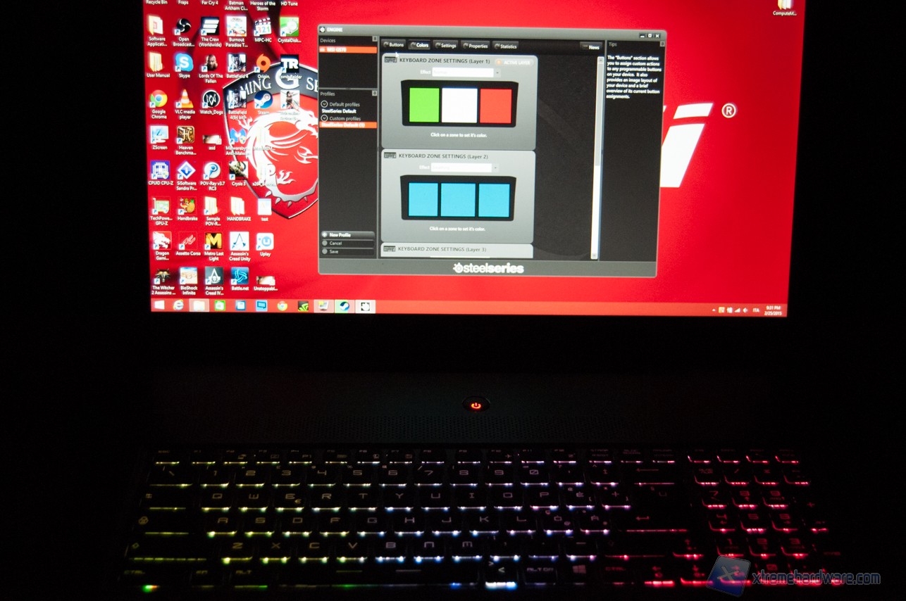 Grazie al software integrato e sviluppato da Steelseries, infatti, possiamo scegliere quale colore impostare alla zona di retroilluminazione, se attivare l'illuminazione a "onda", se far cambiare colore progressivamente alla retroilluminazione ecc. Salvando, il PC cambierà immediatamente aspetto.