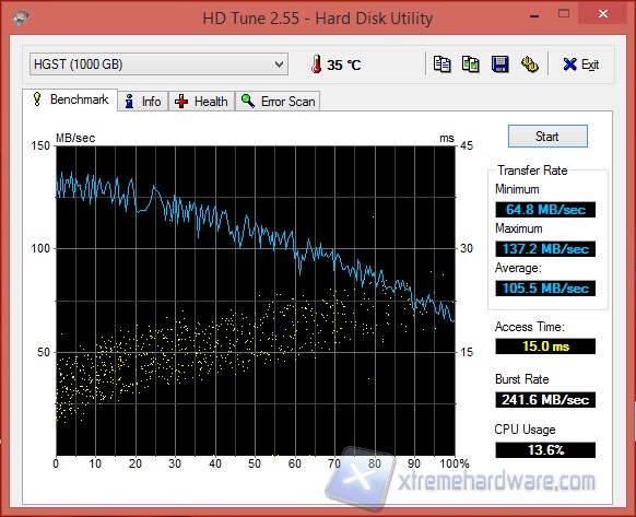Il comportamento del disco meccanico HGST HTS721010A9E630 (a destra) non sfigura affatto però superando abbondantemente i 100MB/s come velocità di trasferimento e mantenendo un tempo di accesso pari a 15ms.