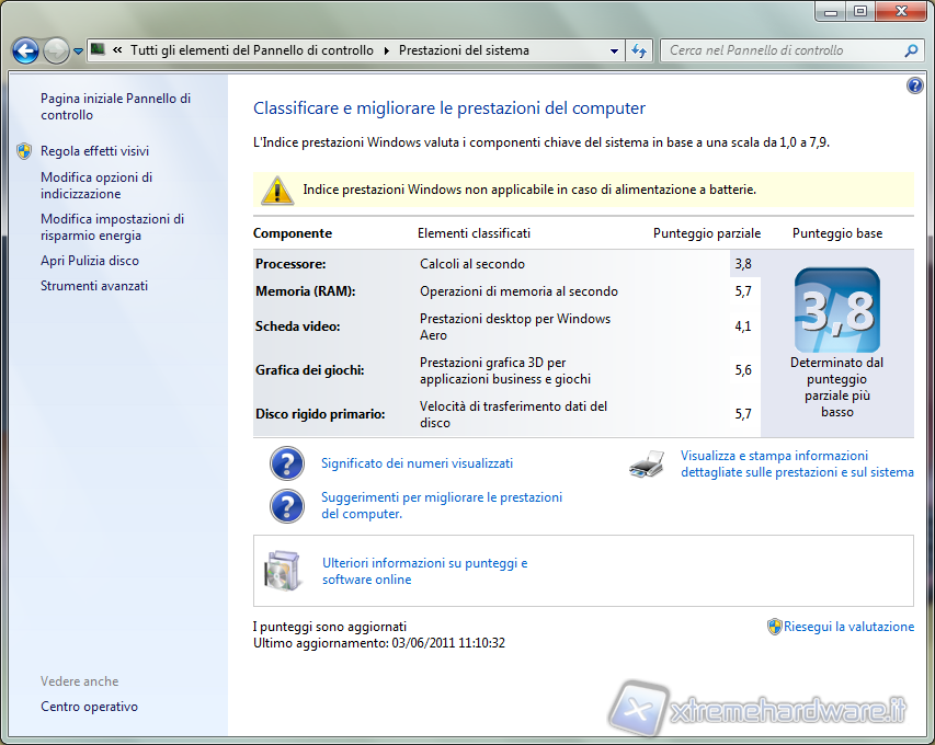 Inoltre, tramite il pannello di controllo, abbiamo visualizzato con l'utility "Prestazioni del Sistema" il voto che il Sistema Operativo Microsoft Windows 7 Home Premium attribuisce al PC in uso. Come si può notare dall'immagine sottostante il voto più basso è attribuito alla CPU AMD E-350.