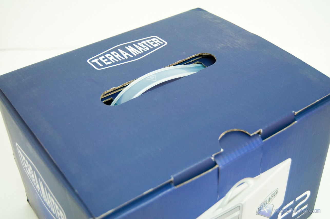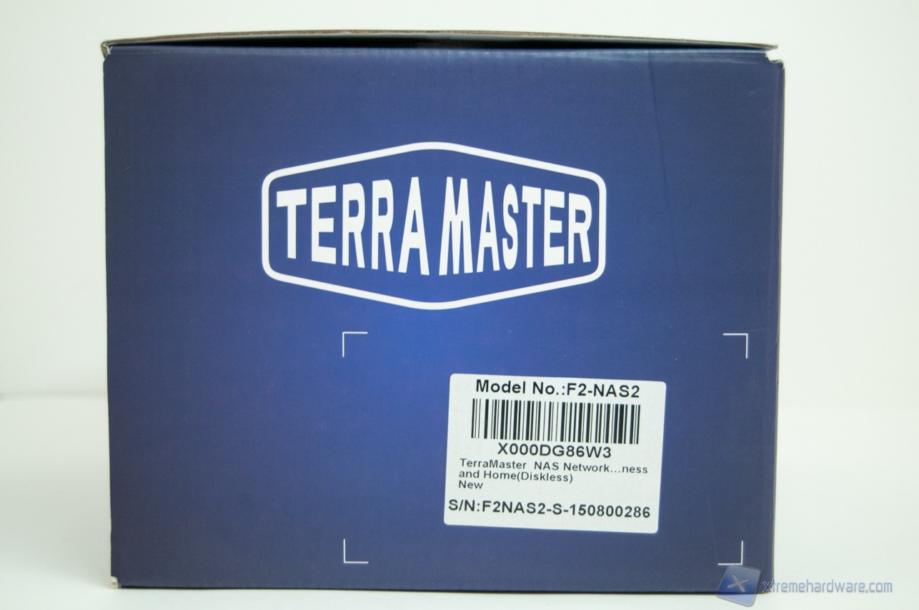 Il TerraMaster F2-NAS2 viene venduto all’interno di una confezione di cartone dal colore blu profondo, sulla quale troviamo le informazioni strettamente necessarie, il modello del NAS, scritto a caratteri cubitali, un’immagine dello stesso e null’altro.
