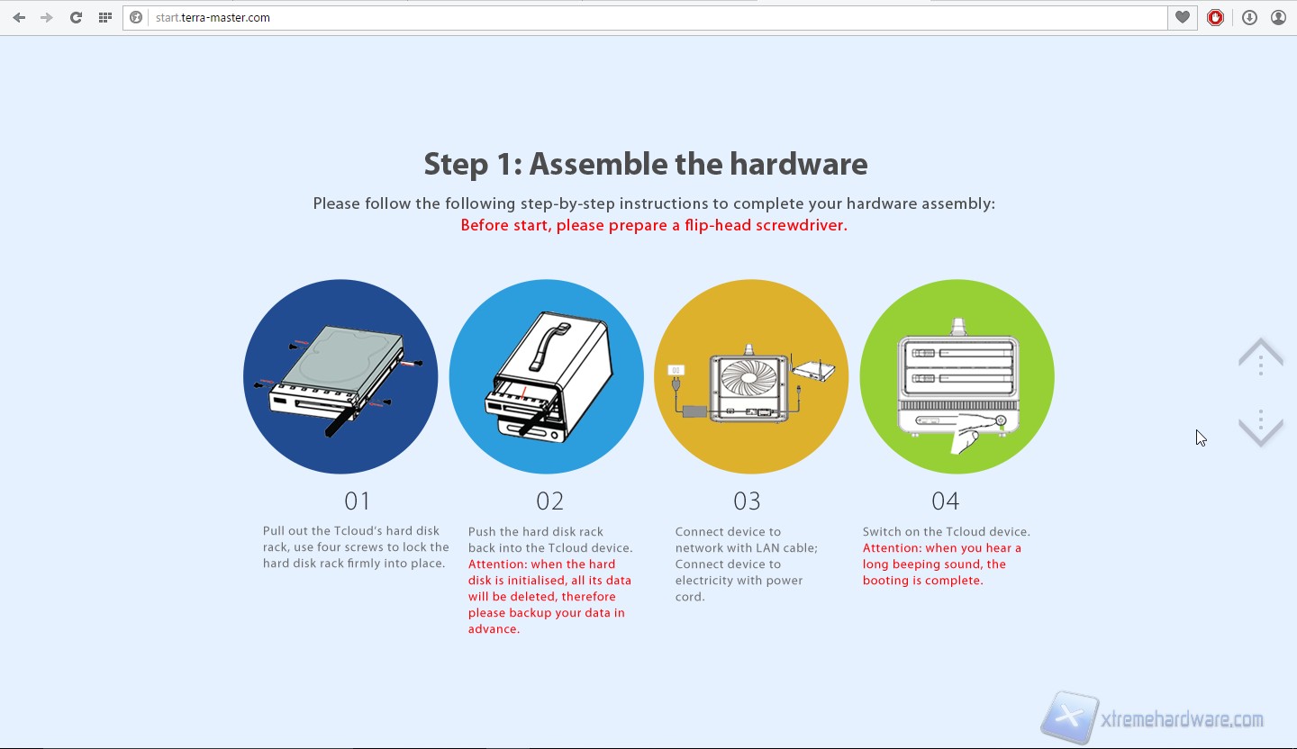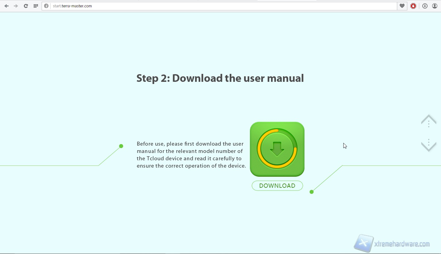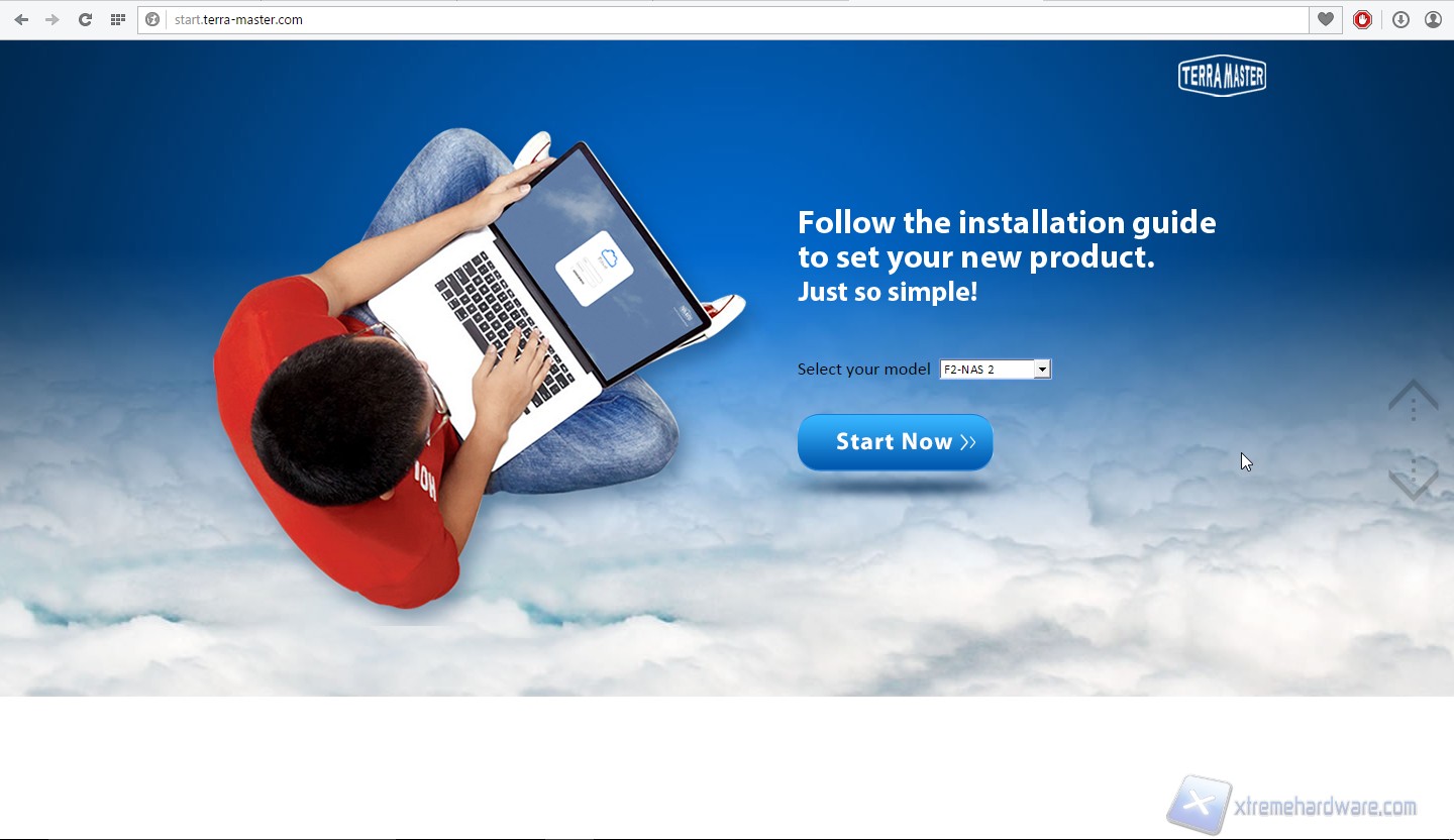 Passiamo dunque alla prima configurazione di sistema. Colleghiamo il prodotto alla corrente ed alla rete ed avviamolo. Sentiremo inizialmente due “beep”, uno quando collegheremo il prodotto alla presa elettrica ed uno dopo aver premuto il tasto di avvio. Rechiamoci dunque sul sito “start.terra-master.com”; veniamo accolti da una schermata introduttiva dove è possibile scegliere dal menù a tendina il modello del NAS che vogliamo configurare, scegliamo F2-NAS2.
