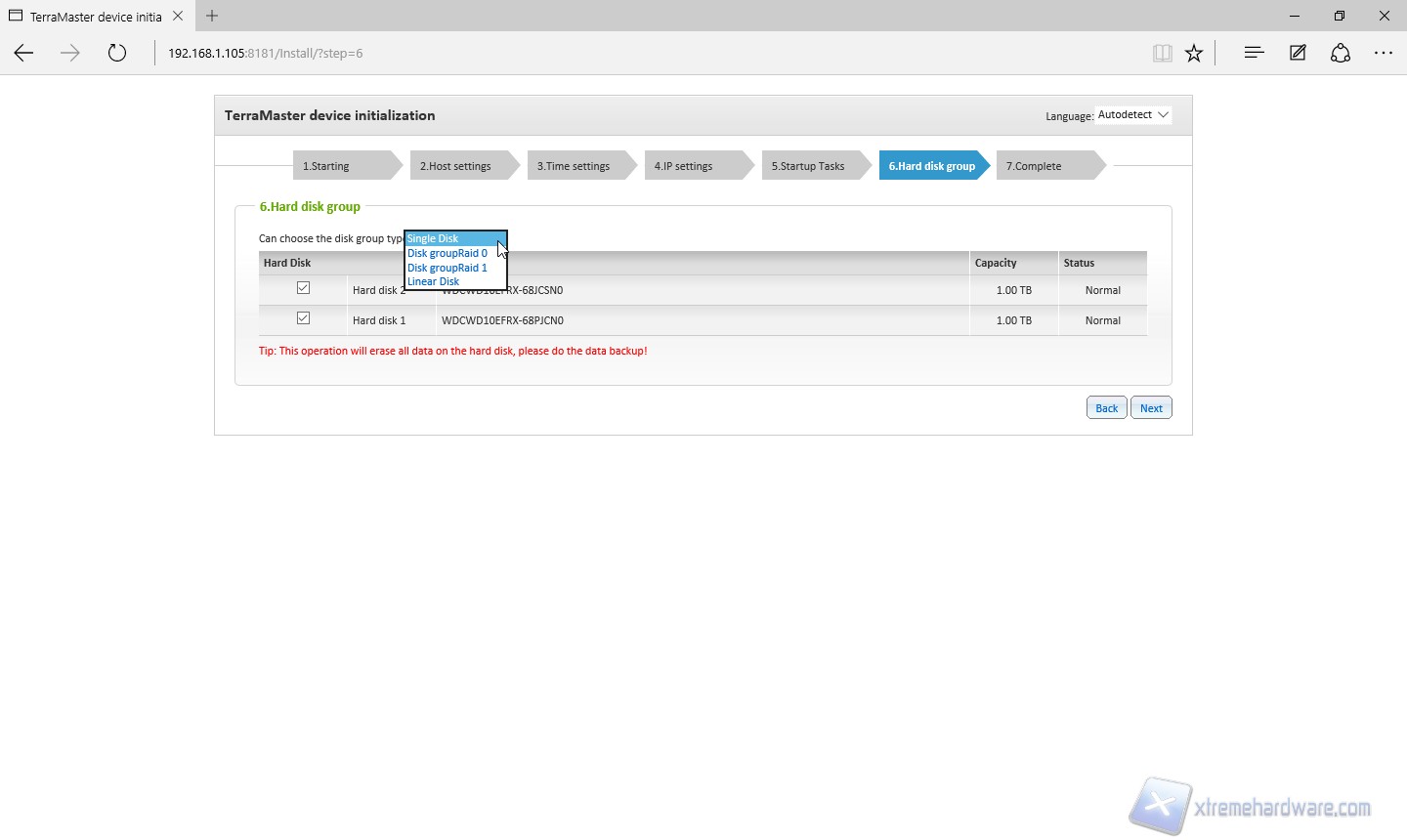 Nel sesto step impostiamo i dischi; possiamo scegliere tra un volume RAID 0, RAID 1, JBOD o dischi singoli.
