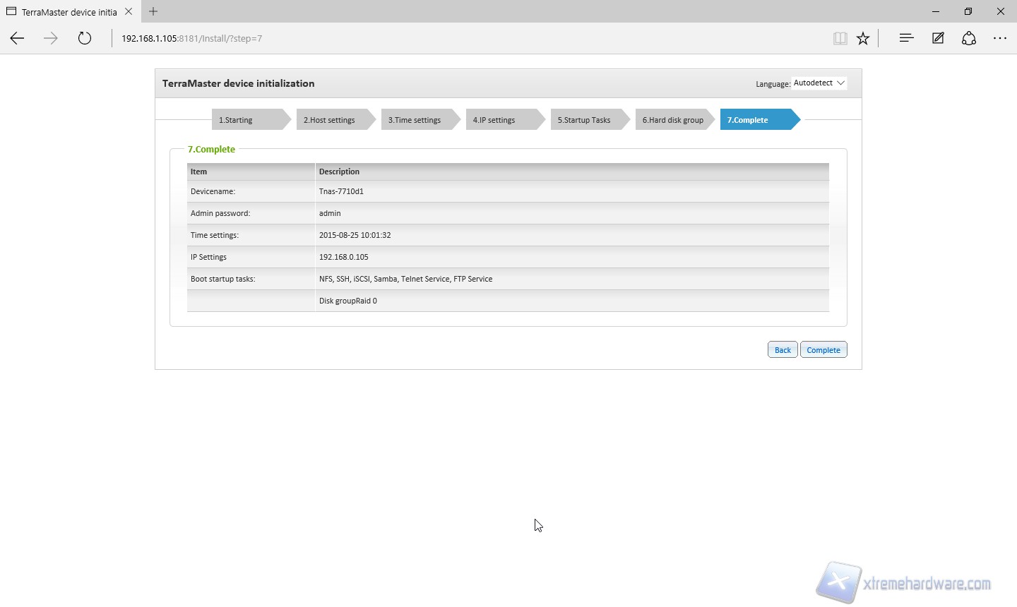 Nell’ultima fase troviamo un riassunto delle scelte effettuate, clicchiamo su “complete” ed attendiamo che il sistema completi la configurazione.