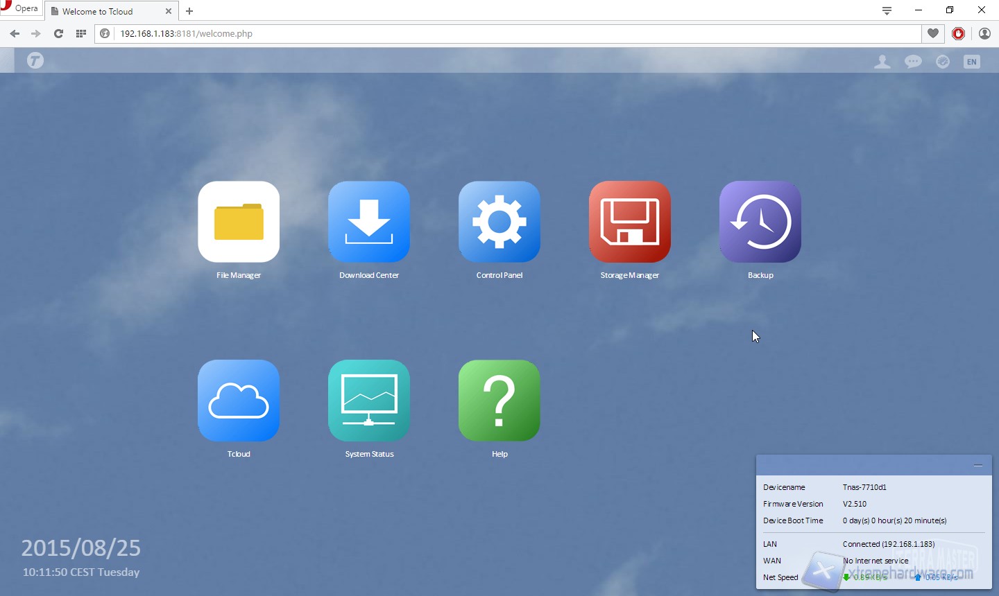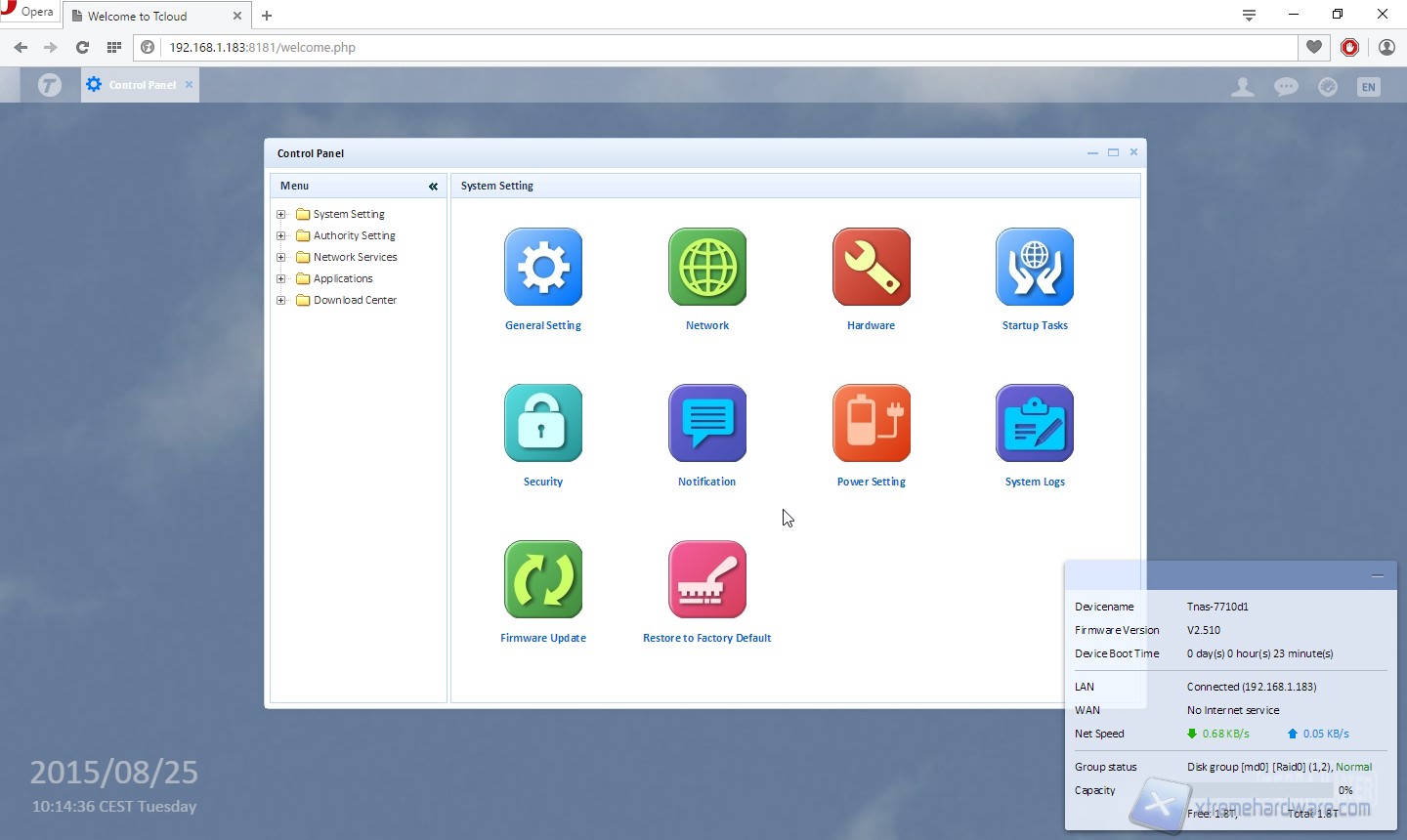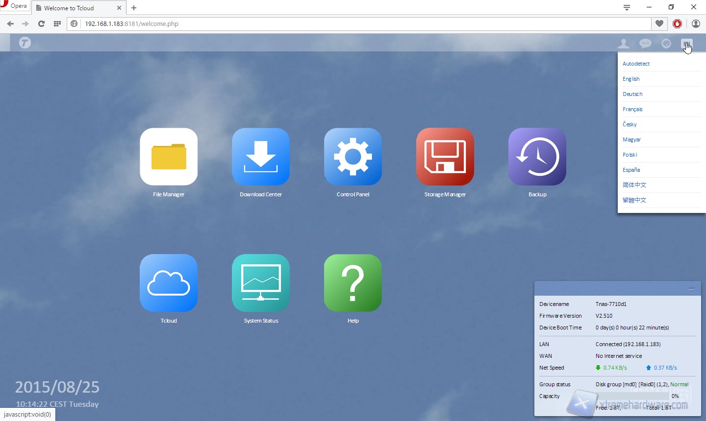Veniamo accolti da un sistema dotato di un’interfaccia grafica molto ben sviluppata ed user-friendly, che ci ricorda un po’ quanto visto su prodotti di Synology, QNAP o Asustor. Nella parte bassa, a destra, troviamo un task che ci informa sull’attività di sistema, il centrale è caratterizzato da grandi icone che ci rimandano a numerose funzioni di sistema, come il pannello di controllo, lo storage manager, il download manager o il file manager.