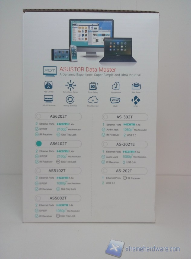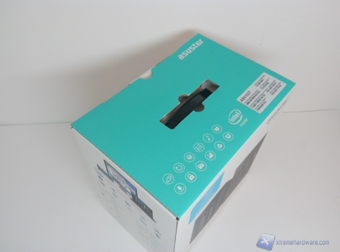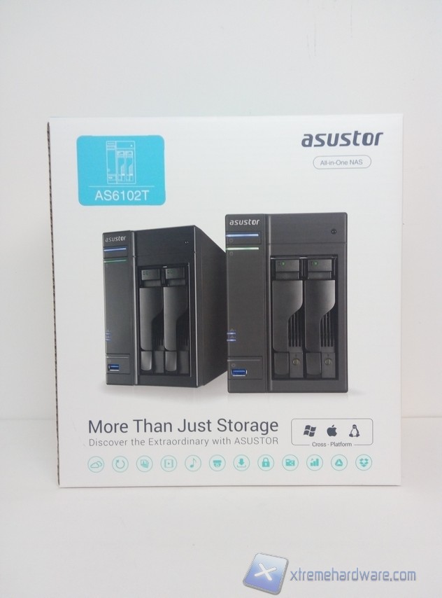 La confezione dell’AS6102T è bianca con il top color azzurro e riporta numerose informazioni utili all’acquirente. La parte frontale presenta l’immagine del prodotto, il modello e la scritta “More Than Just Storage”. Più in basso possiamo notare numerose icone relative ai vari servizi ed applicazioni che il sistema permette all’utente di utilizzare.