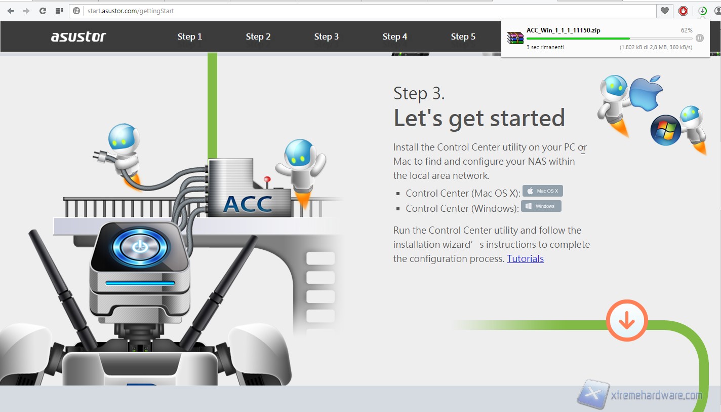 I primi due step son semplicemente informativi, mentre al terzo punto dovremo scaricare il software Asustor Control Center, tramite il quale potremo rilevare il NAS presente in rete e procedere con la configurazione vera e propria.