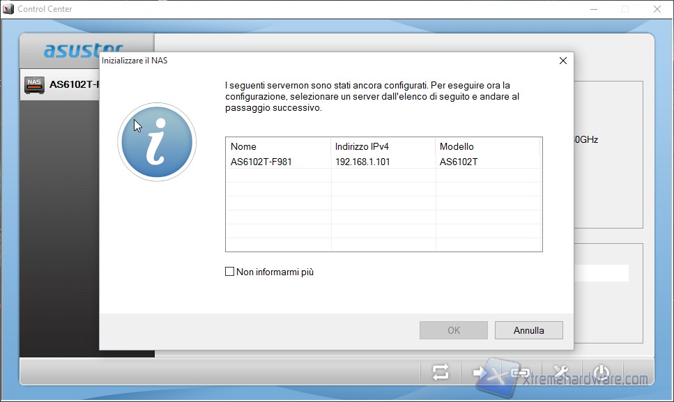 Una volta scaricato ed installato avviamo il Control Center che immediatamente ci avviserà di aver rilevato all’interno della rete il nostro AS6102T, chiedendoci dunque se vogliamo far partire la configurazione guidata; accettiamo.