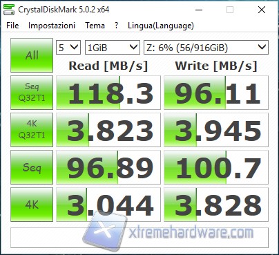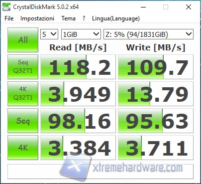 In fase di lettura sia con volume RAID 0 che RAID 1 abbiamo un risultato strabiliante, con valori che superano di poco i 118MB/s.