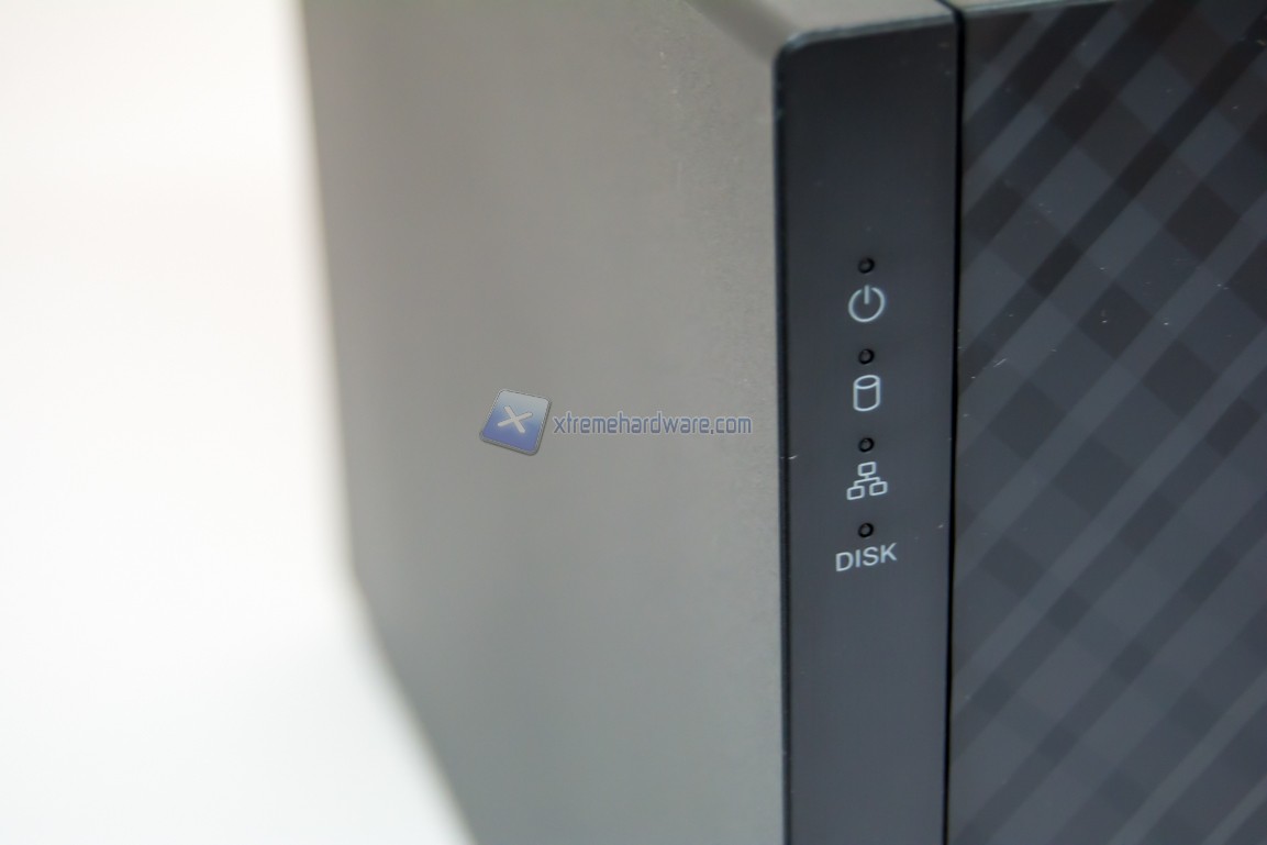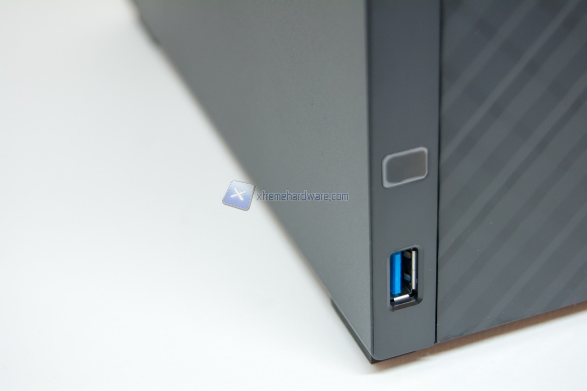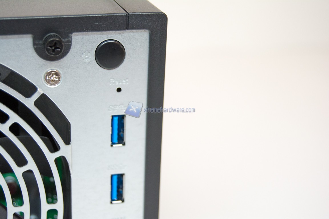 In alto a destra (per chi guarda) troviamo il logo dell’azienda in rilievo e di color oro mentre sulla sinistra trovano posto quattro led di indicazione, rispettivamente per accensione, attività di sistema, attività di rete e dei dischi ed una porta USB 3.0 con tasto di copia veloce.