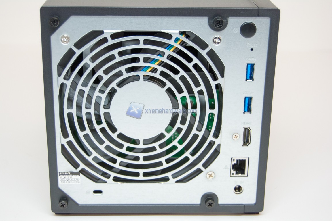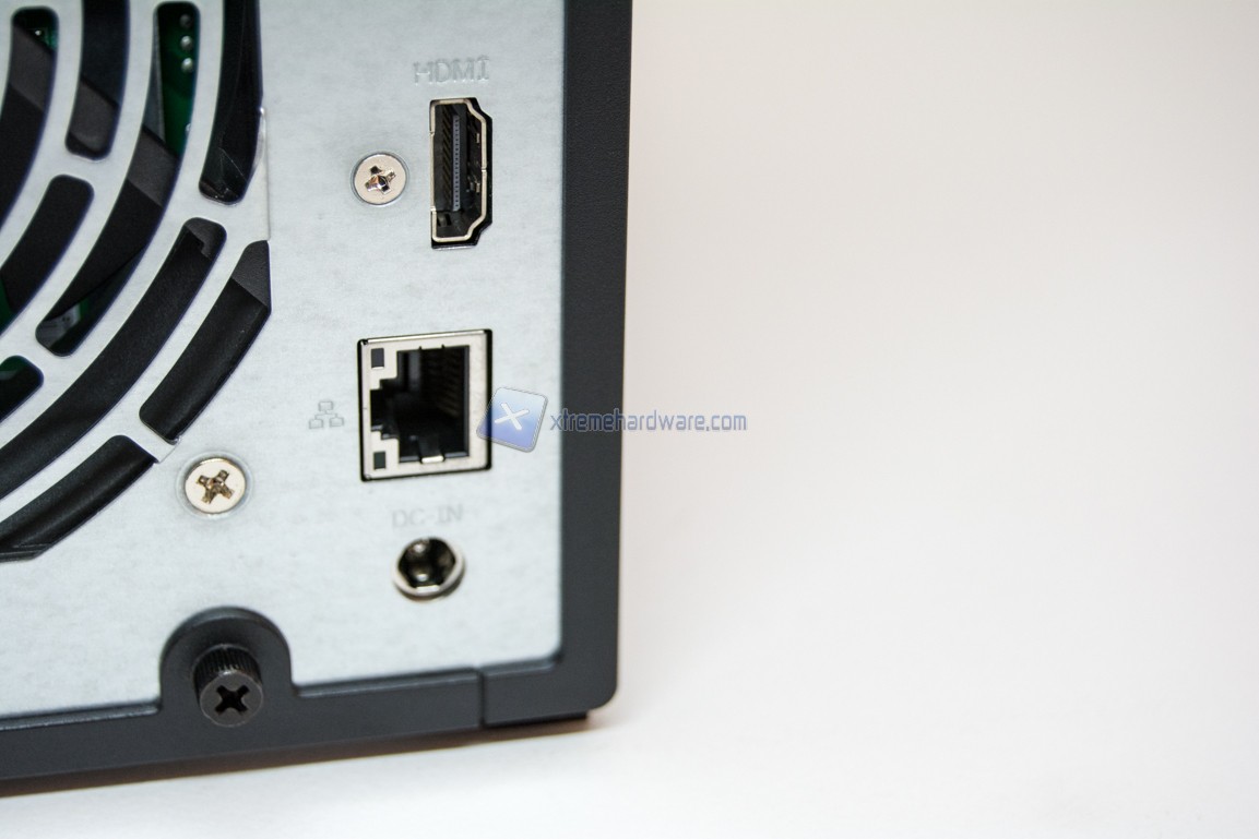 A destra della grande ventola trova posto il tasto di accensione, il bottoncino del reset, due porte USB 3.0 una porta HDMI, una porta di rete GigaBIT LAN RJ-45 ed il plug per l’alimentazione.