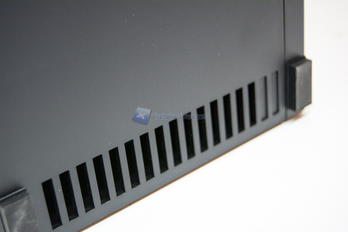 Sul fondo del prodotto troviamo quattro piedini in gomma anti-scivolo, le etichette riportanti informazioni utili sul prodotto,quali ad esempio le specifiche di alimentazione del sistema e una griglia che facilita l’ingresso di aria fresca all’interno del prodotto.