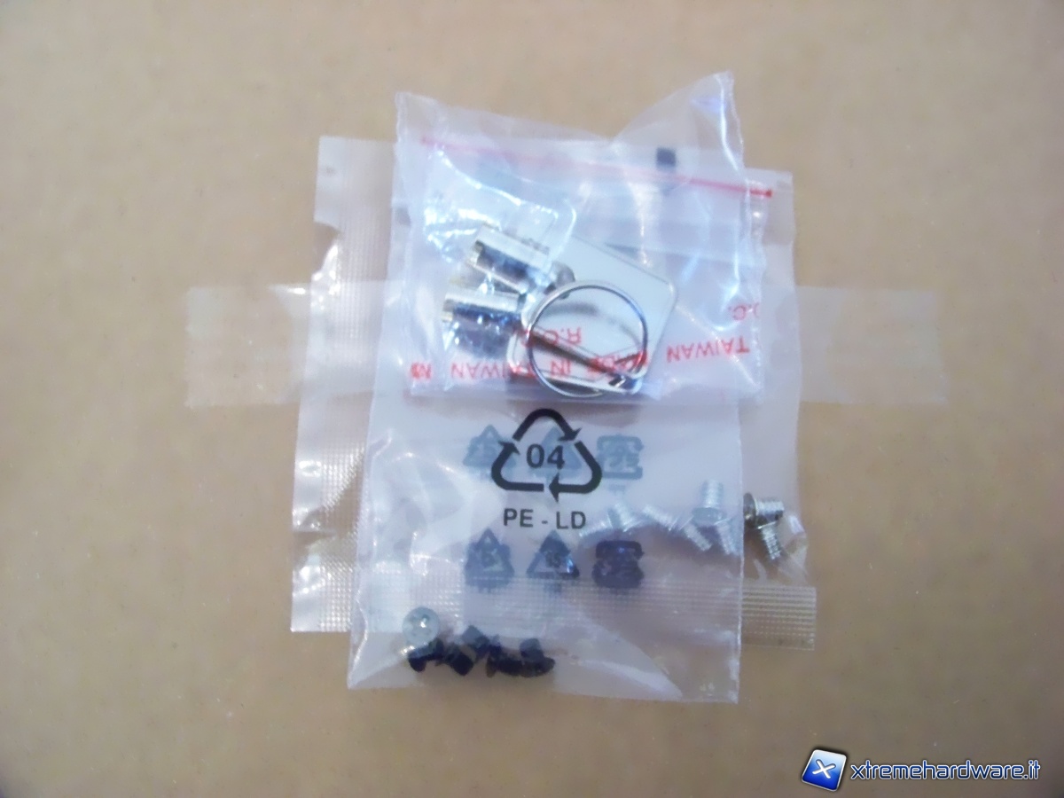 Oltre a tale dotazione possiamo notare che all’interno di tre bustine in plastica vi sono due chiavi per chiudere le due serrature dei bay porta hard disk e le viti di fissaggio per gli hard disk stessi.