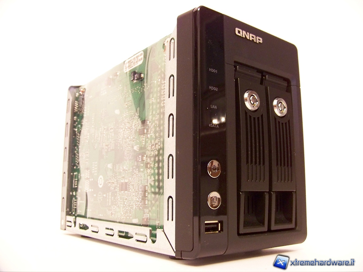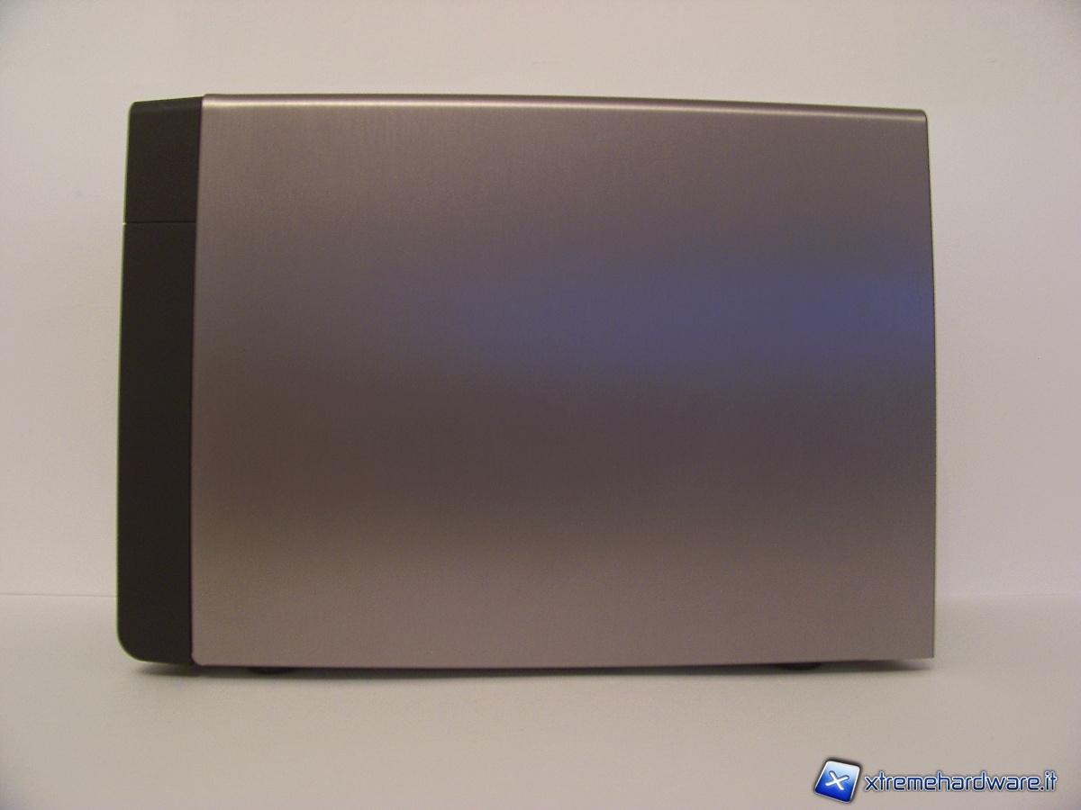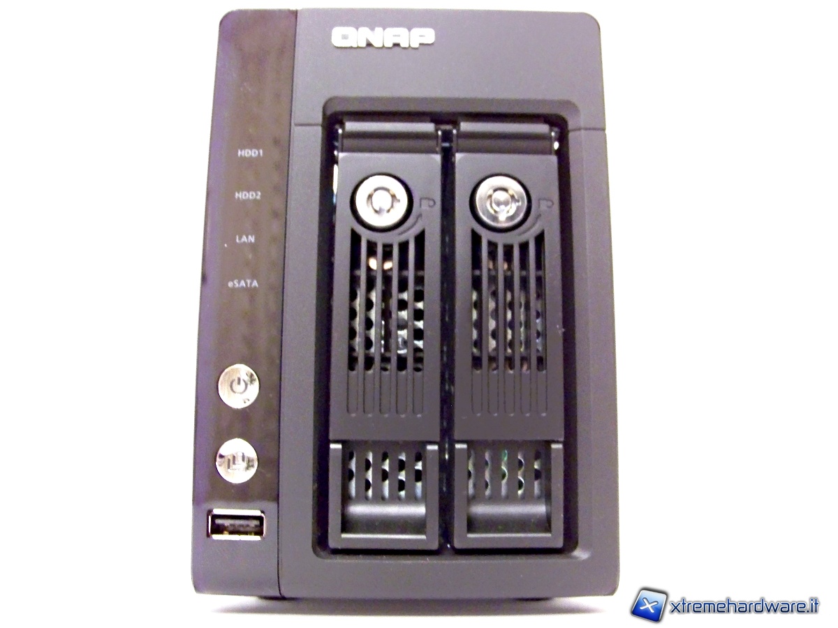 Nel pannello frontale sono presenti il tasto di accensione, un tasto per la copia veloce da USB, una porta USB 2.0 e quattro spie luminose, due per gli hard disk, uno per l’attività LAN e una per l’eSATA.