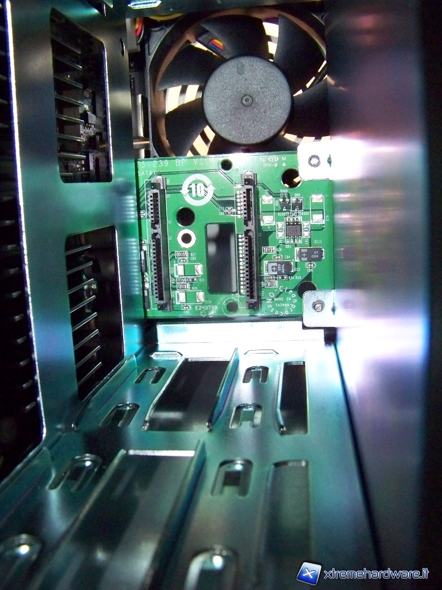 Una volta rimosse le slitte sulle quali montare andranno montati gli hard disk, possiamo notare all’interno del box i connettori SATA e una ventola che garantisce il raffreddamento del sistema.
