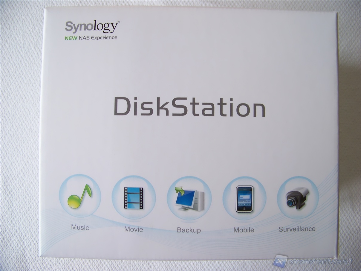 La parte frontale riporta il nome della famiglia di appartenenza del prodotto, DiskStation, scritto in grigio e delle icone riportanti alcune delle features più importanti.