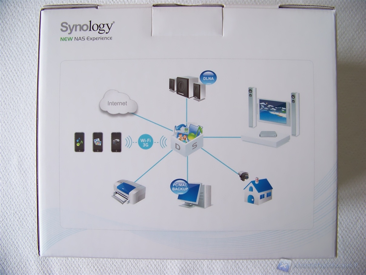 Anche il retro è completamente bianco con, raffigurata al centro, un'immagine riportante una rete locale in grado di mostrare quale tipi di accesso sono possibili sul NAS Synology e da quali apparecchi; smartphone compresi.