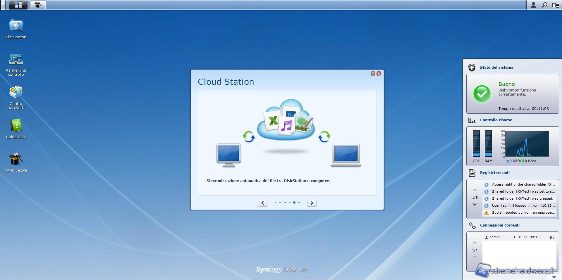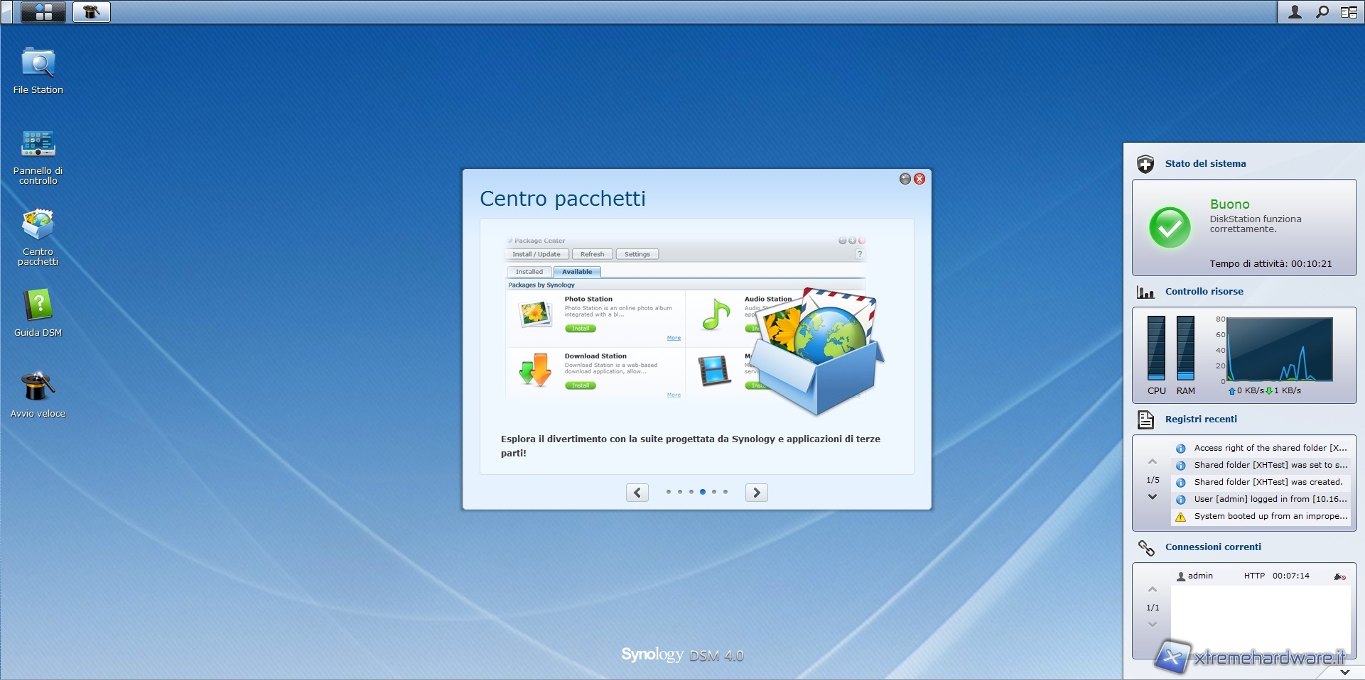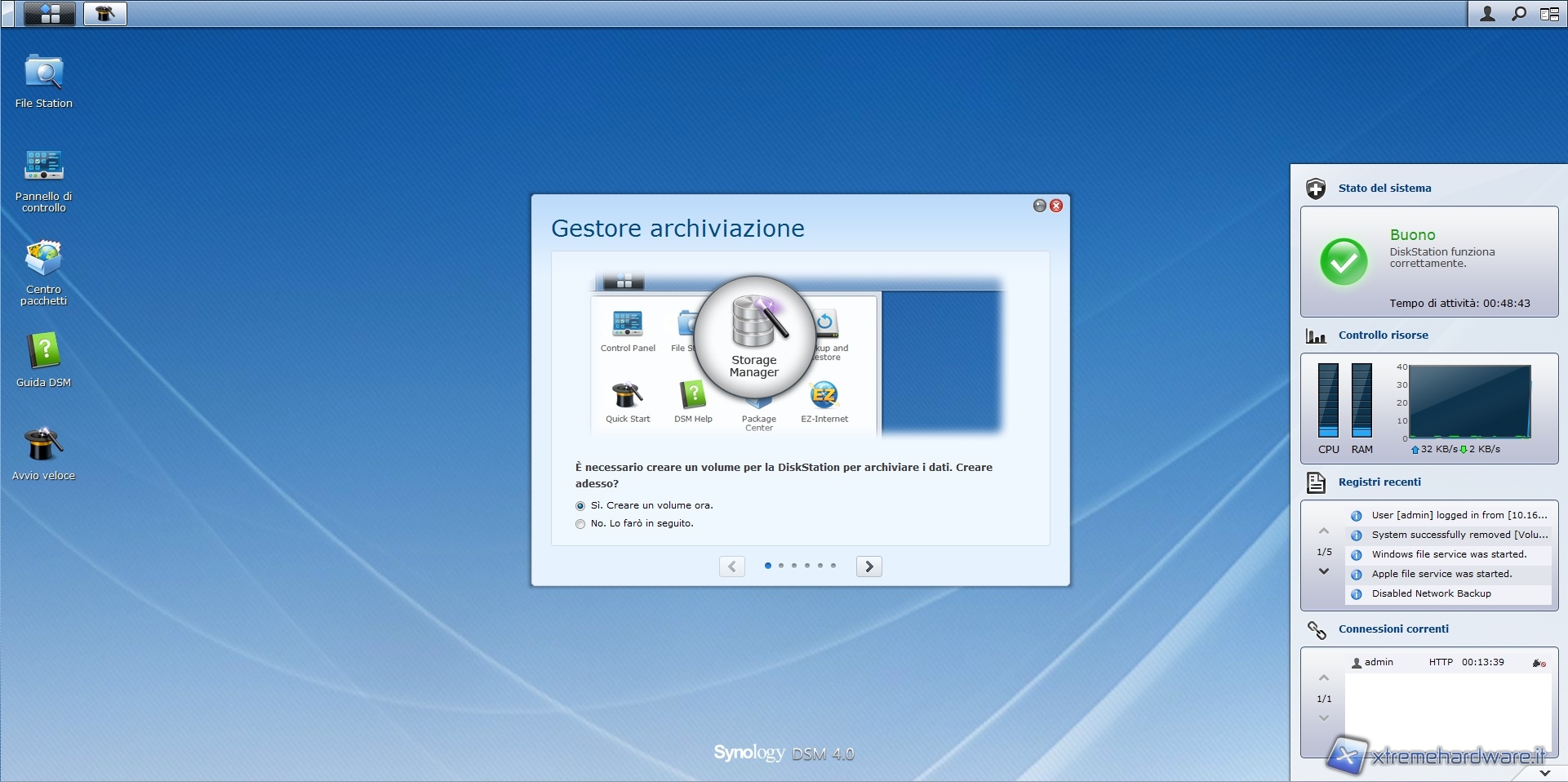 Dopo aver effettuato l'accesso ci troviamo all'interno del software di gestione, il DSM 4.0, che mette a disposizione, come potete vedere nelle immagini sottostanti, una comoda dock laterale in grado di mostrare l'attività del sistema; dall'utilizzo della CPU e RAM al registro degli eventi.