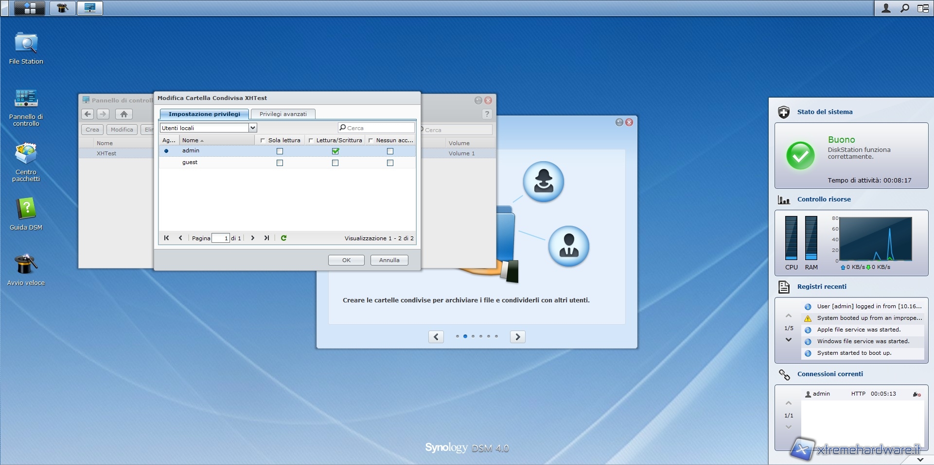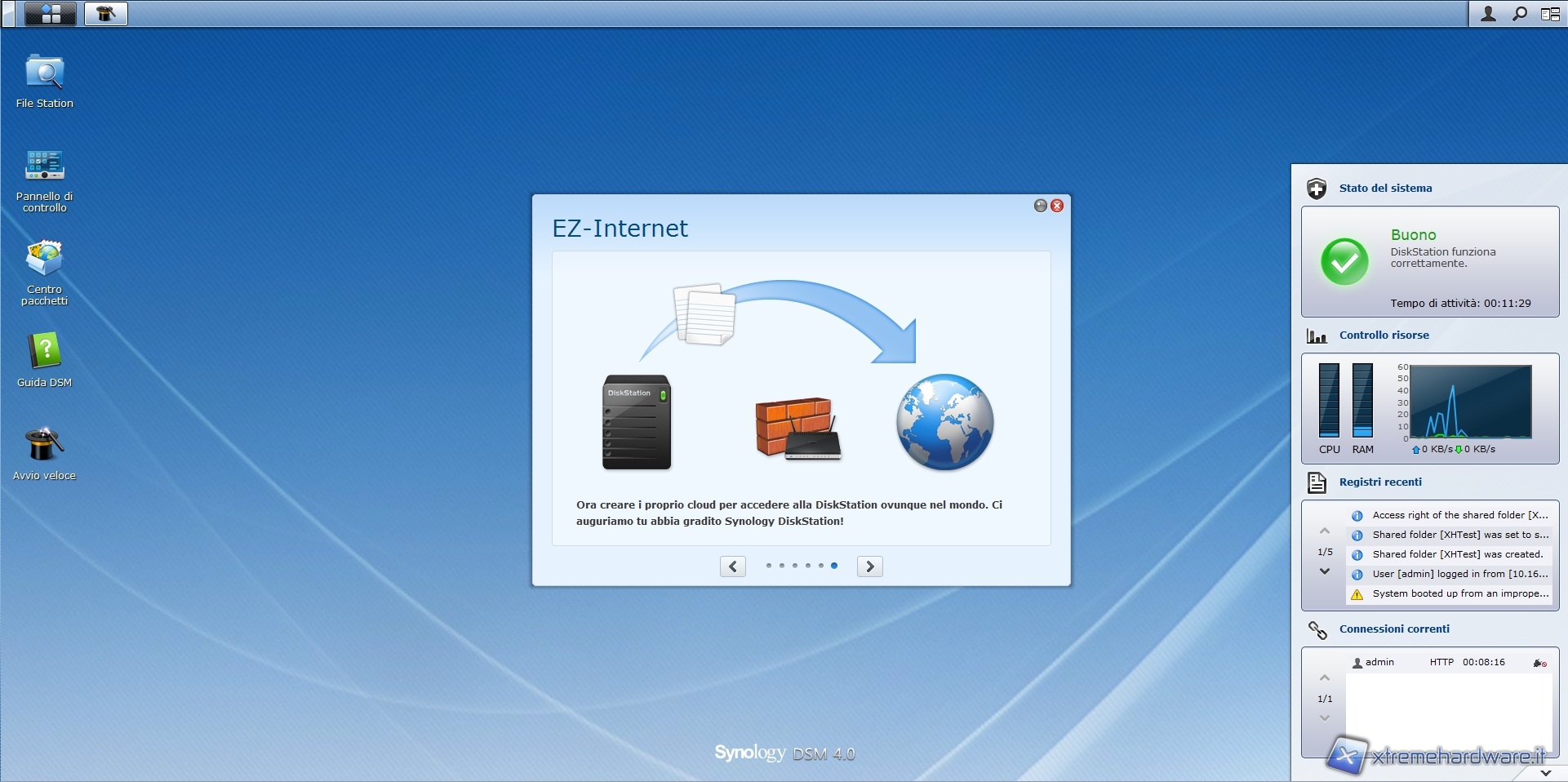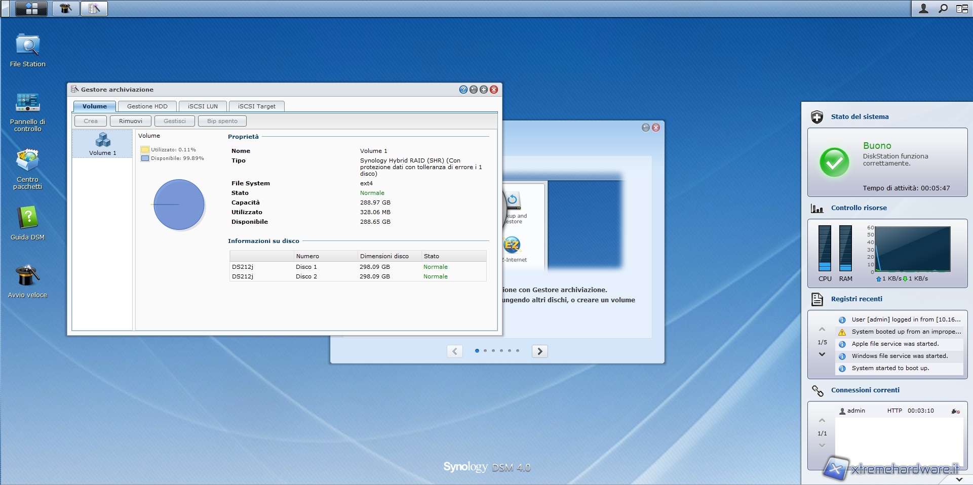 Dopo aver effettuato l'accesso ci troviamo all'interno del software di gestione, il DSM 4.0, che mette a disposizione, come potete vedere nelle immagini sottostanti, una comoda dock laterale in grado di mostrare l'attività del sistema; dall'utilizzo della CPU e RAM al registro degli eventi.