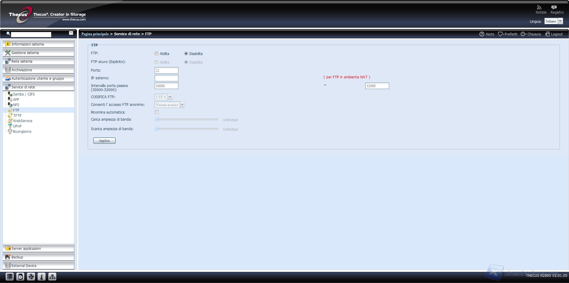 Altro servizio che il Thecus N2800 mette a disposizione è il WebService, che permette la navigazione all’interno del NAS tramite protocollo http o il più sicuro HTTPS.