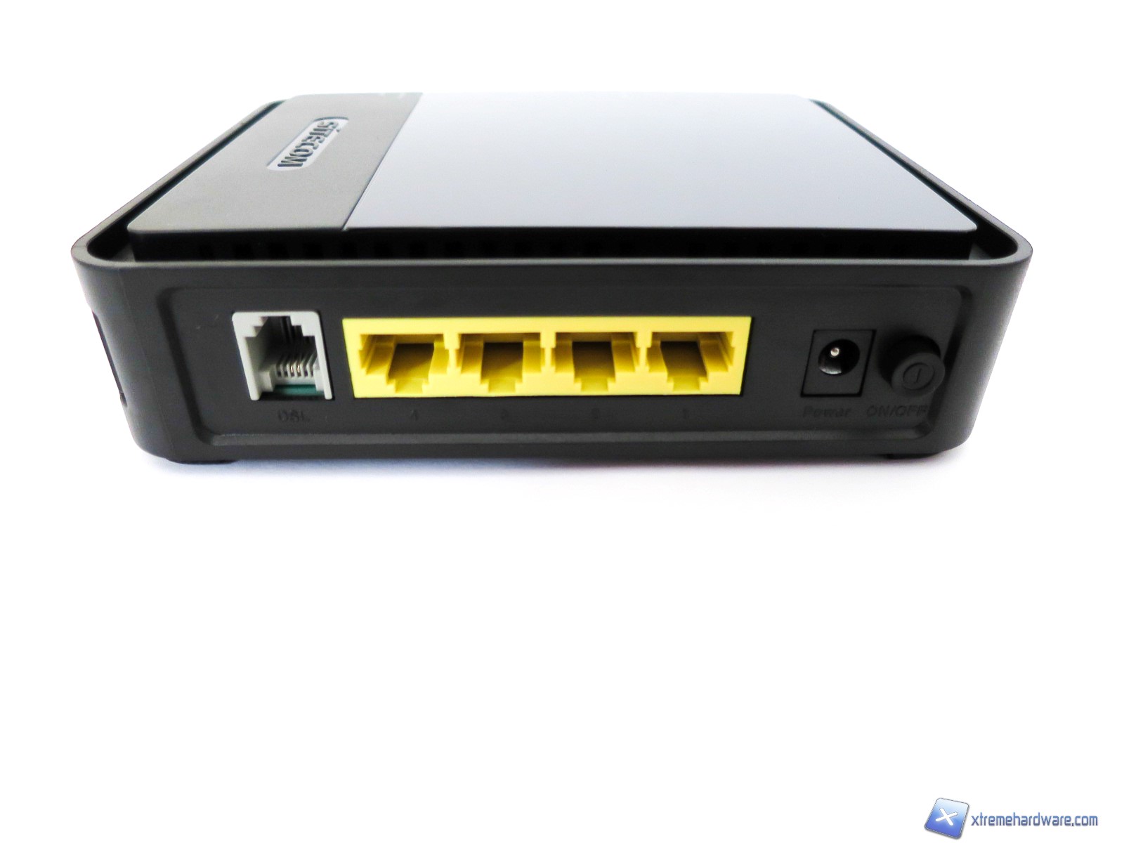 Passando ai lati destro e sinistro e partendo da quello di destra abbiamo la classica disposizione di ingressi. Nel dettaglio e partendo da destra verso sinistra abbiamo: l’ingresso RJ-11 per il cavo telefonico, quattro ingressi LAN RJ-45 di colore giallo e senza LED di stato, l’ingresso per il connettore di alimentazione ed infine il classico pulsante per l’accensione/spegnimento del prodotto. Seppur gli ingressi LAN (in standard 10/100 Mbps) siano di colore giallo, sono poco visibili grazie anche alla piccola rientranza degli stessi.