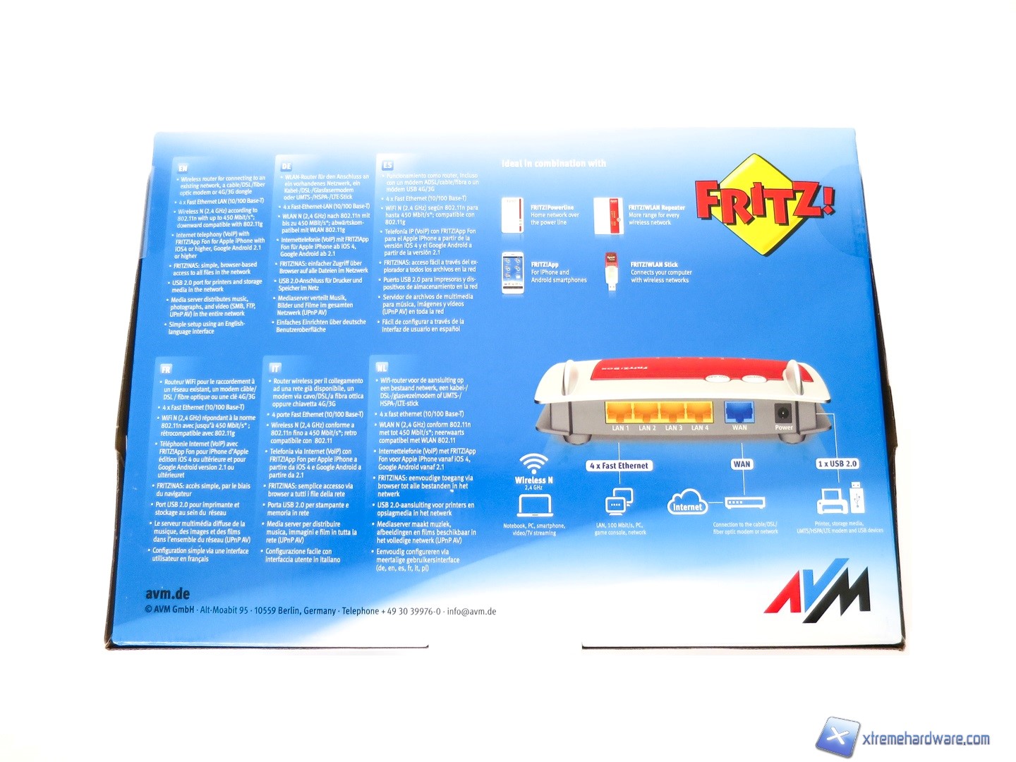 Il piccolo router FRITZ!Box 4020 giungerà in una classica confezione di cartone con su stampate tutte le informazioni tecniche e le immagini illustrative del prodotto.