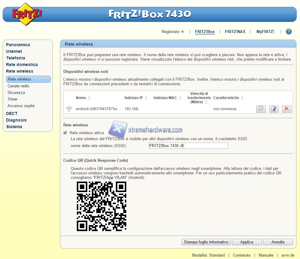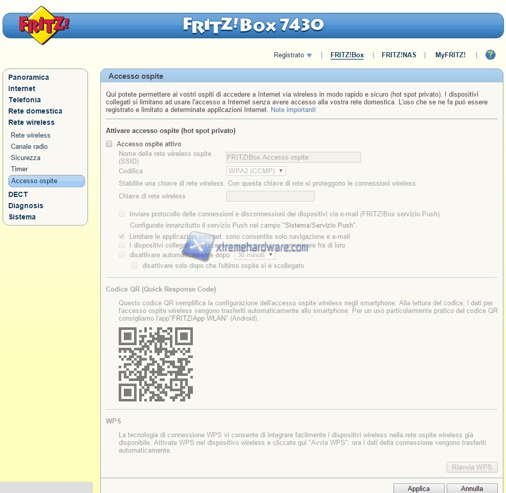 A seguire, con il Menù ‘’Rete Wireless’’, potremo gestire le connessioni wireless al nostro router. Abbiamo anche un QR Code il quale se scansionato consentirà di avere già i dati sul nostro smartphone. Inoltre potremo disattivare il modulo WiFi in modo del tutto automatico agendo su un timer impostabile o cambiare Canale Radio o Gestire un eventuale accesso Ospite.
