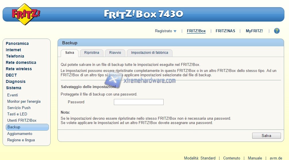 Dunque una volta collegati all’indirizzo ci verrà mostrata una schermata in lingua tedesca (non dimentichiamo che l’azienda AVM è tedesca) la quale ci dirà di inserire la password che troverete o sotto il router o nella guida di installazione cartacea fornita con il bundle.