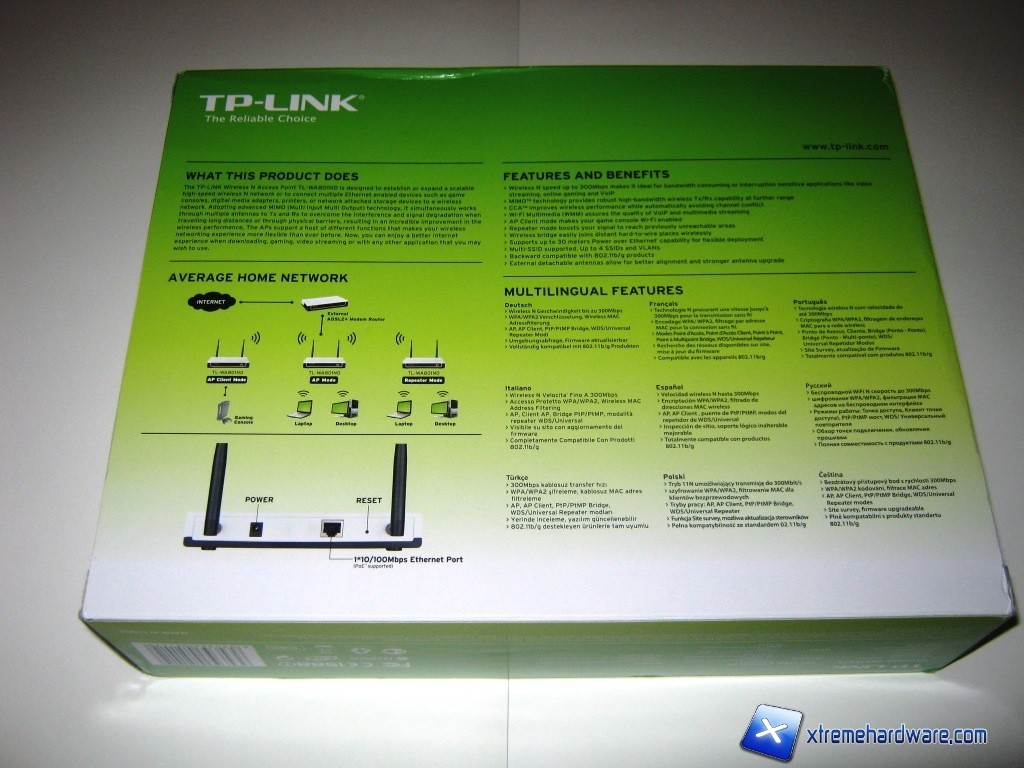 Sul retro della confezione, troviamo un disegno che spiega le varie modalità di funzionamento dell'access point (AP Mode, AP Client Mode, Repeater Mode), un'altra che mostra il retro del prodotto e varie informazioni aggiuntive che descrivono le caratteristiche.