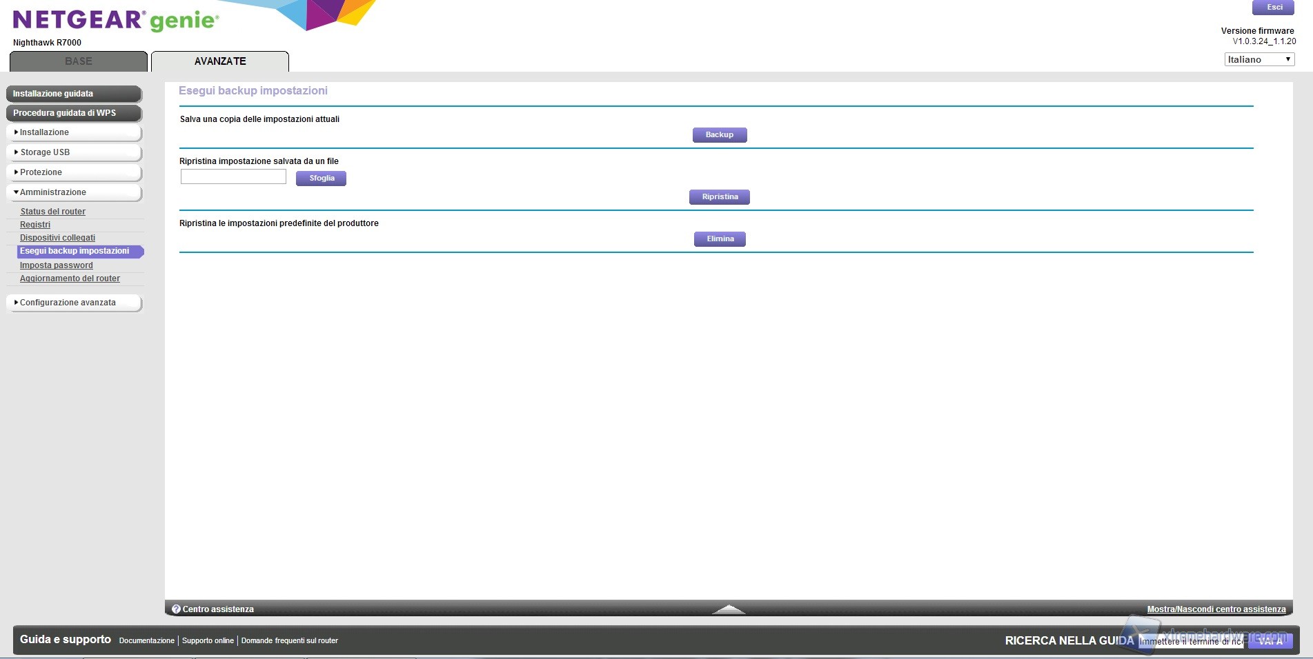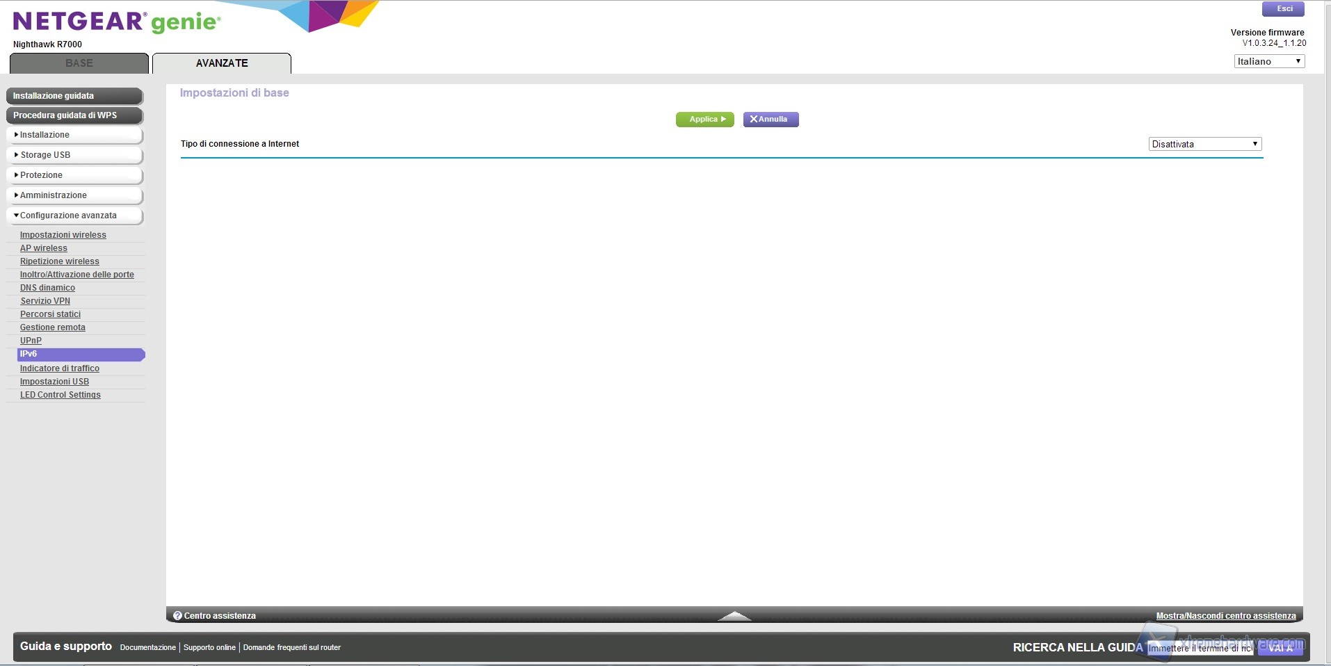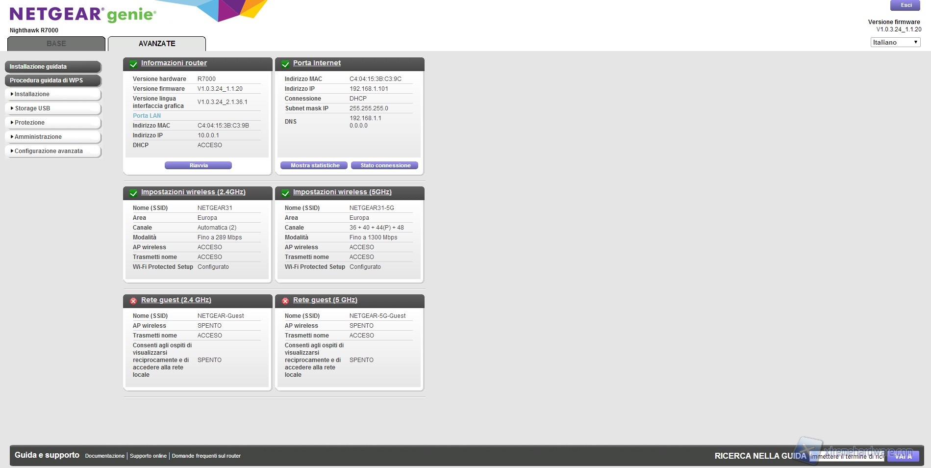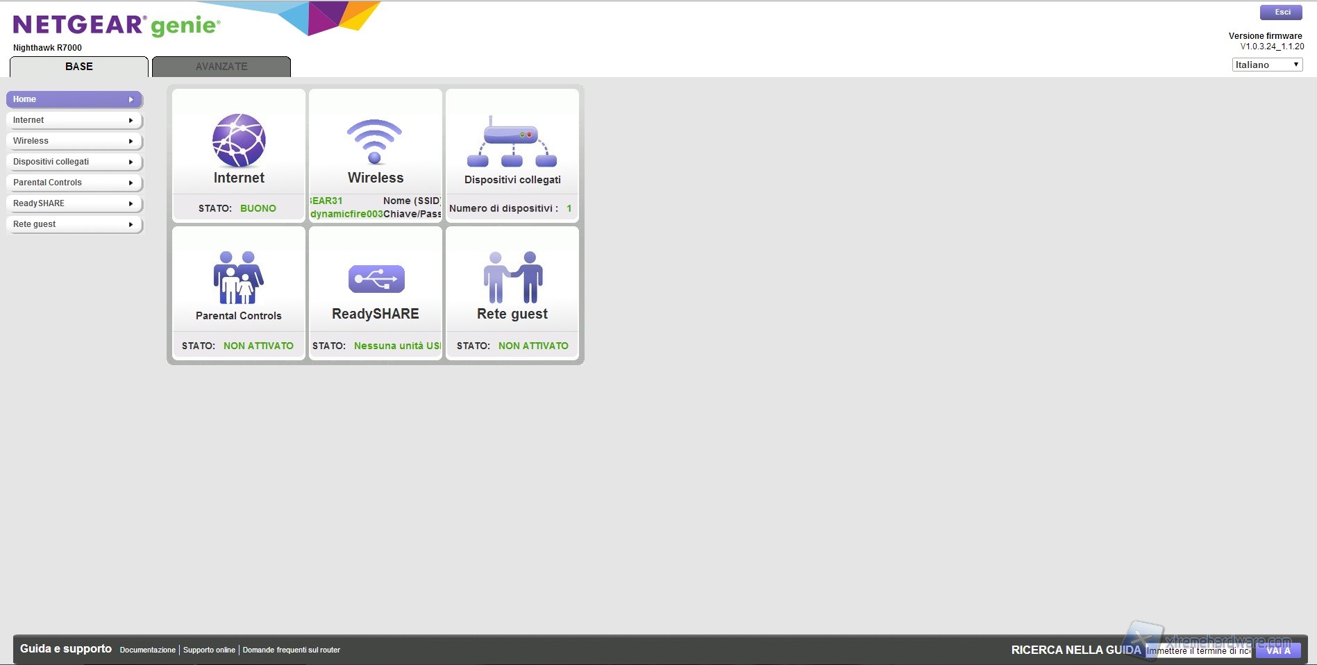 Nella parte sinistra del pannello di controllo troviamo le varie voci che ci permetteranno di settare ogni parametro e impostazione relativa al modem router. Come notiamo, abbiamo due Tab generali “Base” e “Avanzate”. Netgear ha voluto dividerle in base all’esperienza dell’utente. Avremo quindi modo se siamo esperti di personalizzare nel dettaglio le impostazioni del router e le sue regole di connessione tramite la tab “Avanzate”.