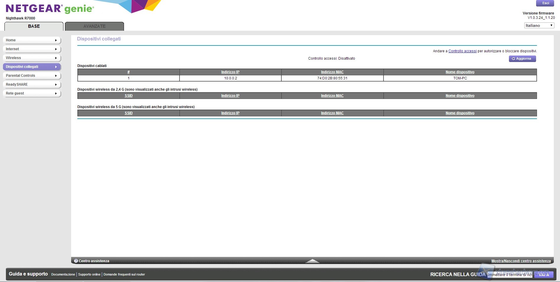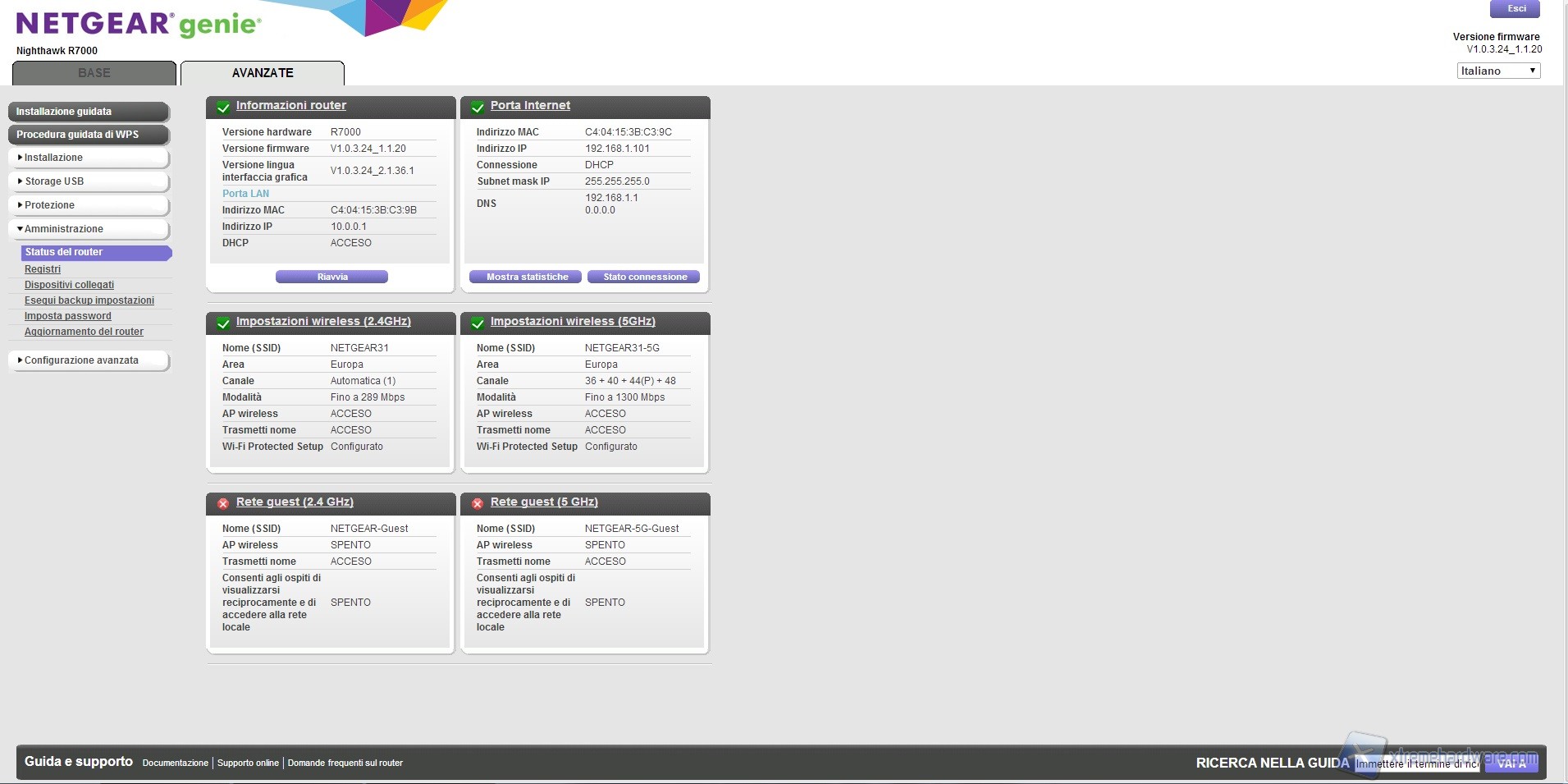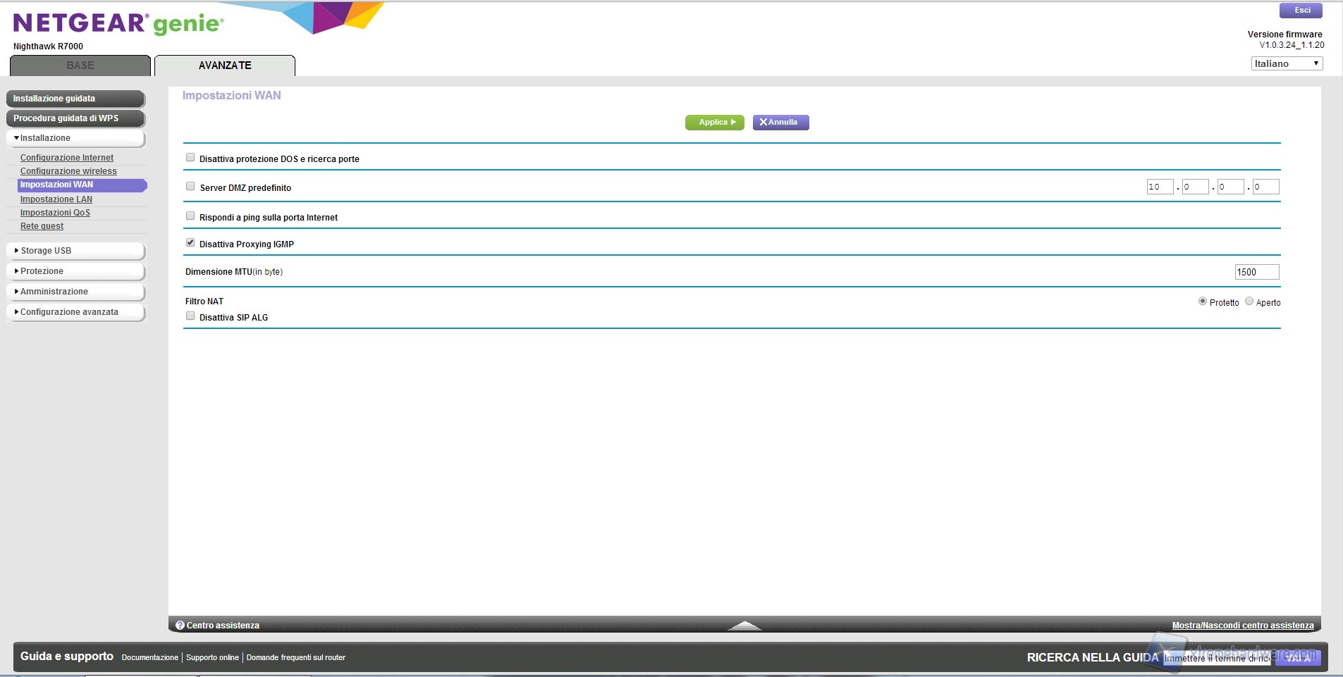 Nella parte sinistra del pannello di controllo troviamo le varie voci che ci permetteranno di settare ogni parametro e impostazione relativa al modem router. Come notiamo, abbiamo due Tab generali “Base” e “Avanzate”. Netgear ha voluto dividerle in base all’esperienza dell’utente. Avremo quindi modo se siamo esperti di personalizzare nel dettaglio le impostazioni del router e le sue regole di connessione tramite la tab “Avanzate”.
