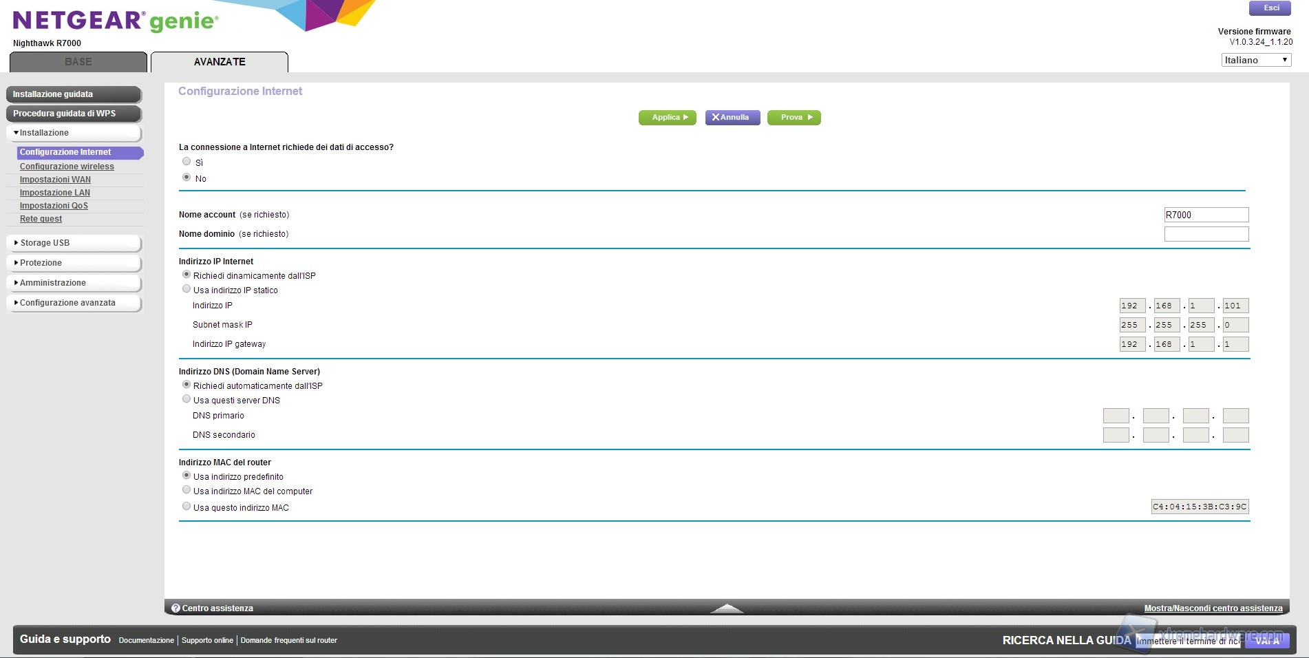 Partiamo dalla tab configurazione internet, nella quale avremo la possibilità di settare i parametri relativi al nostro ISP e gli indirizzi DNS. Infine ci sarà la possibilità di settare la tipologia di indirizzo MAC da utilizzare.