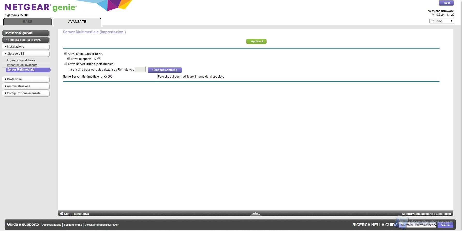Troviamo a seguire la tab “Storage USB” la quale ci permetterà con i suoi sottomenù di configurare al meglio i dispositivi che andremo a collegare al router tramite le porte USB di cui è dotato. Avremo modo di creare delle regole di condivisione e settare le modalità di accesso a tali dispositivi esempio via FTP, HTTP etc. Non manca il servizio DLNA checi permetterà una condivisione veloce e sicura con i dispositivi compatibili con tale standard.