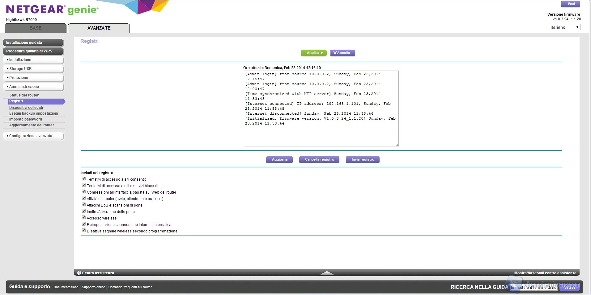 Dalla tab “Amministrazione” avremo modo di gestire il router controllando lo stato del router, i registri del traffico della nostra rete, i dispositivi collegati, impostare una password per l’accesso al pannello di controllo, eseguire un backup delle impostazioni, accedere ad un tool di diagnostica ed aggiornare il firmware del router.