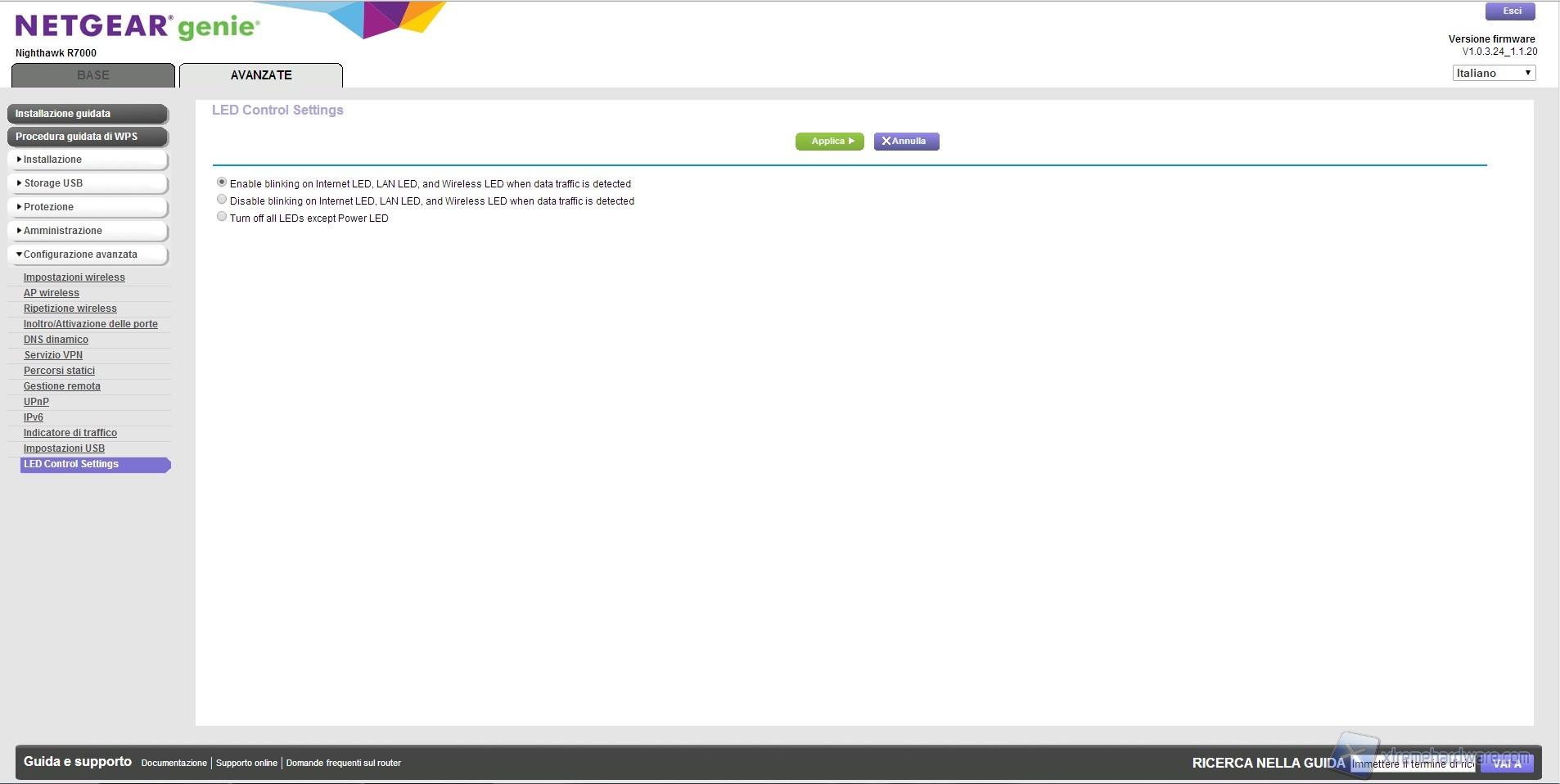Infine troviamo la tab “Configurazione Avanzata” ove potremo modificare le voci di gestione wireless, ripetizione wireless, DNS dinamici, funzionalità IPv6, UPnP per la gestione di una rete che integra dispositivi compatibili con tale standard come TV, decoder, gestione del traffico sulla rete, una gestione remota e le impostazioni USB da cui potremo collegare un hard disk multimediale, una pen drive o una stampante alla nostra rete. Non manca la funzione VPN, presente generalmente solo in router di una certa fascia, e la gestione dei LED del router stesso.