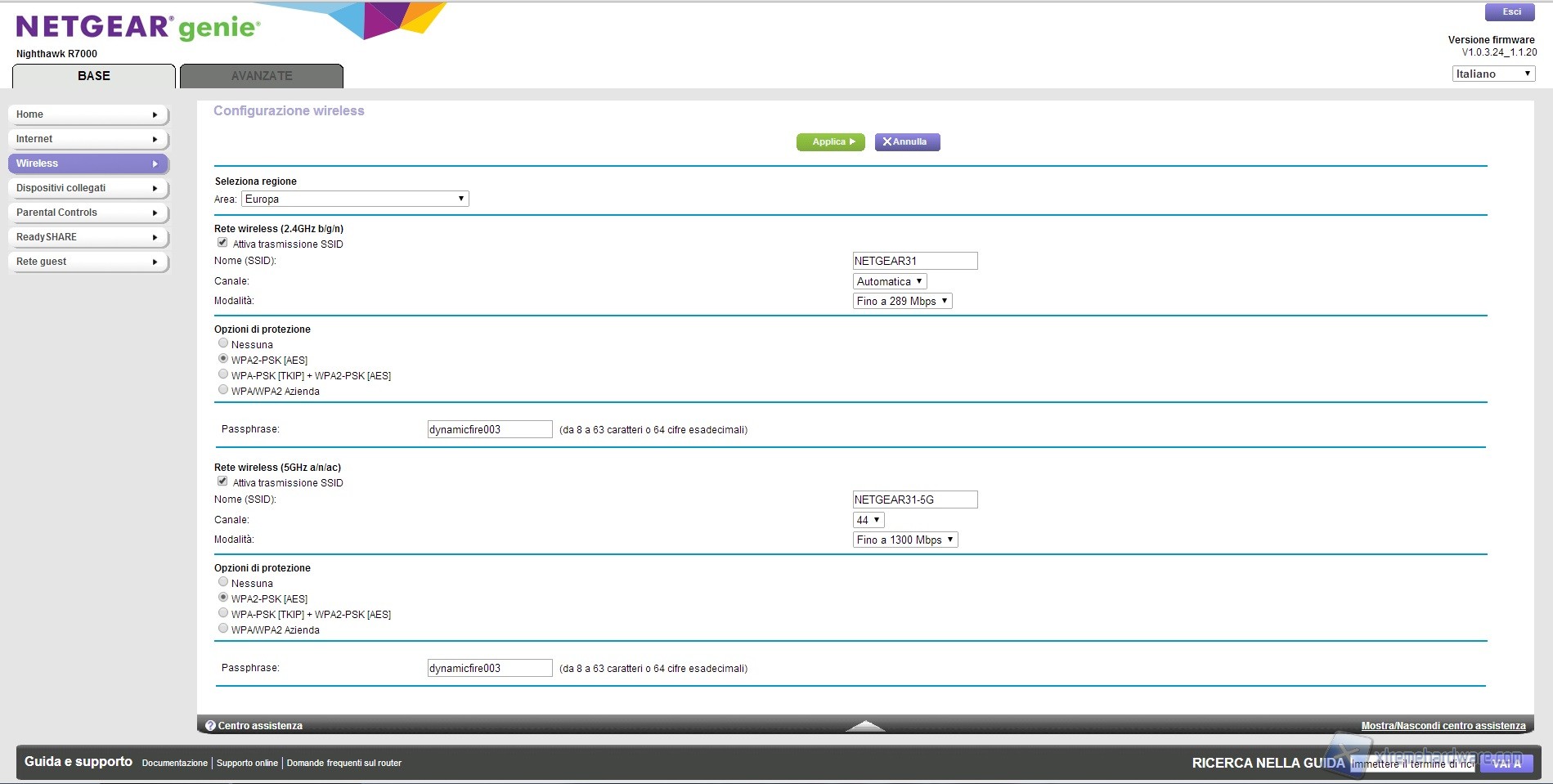 Passando alla tab Configurazione Wireless, avremo accesso a tutti i parametri e le impostazioni inerenti al modulo Wireless del nostro modem router. Avremo la possibilità di cambiare regione e modalità di trasferimento, oltre che cambiare l’SSID, ovvero il nome della nostra rete, e applicare una chiave di crittografia alla nostra rete. In questo menù avremo la possibilità inoltre di settare le impostazioni per entrambe le bande disponibili, ovvero 2.4 e 5 Ghz.