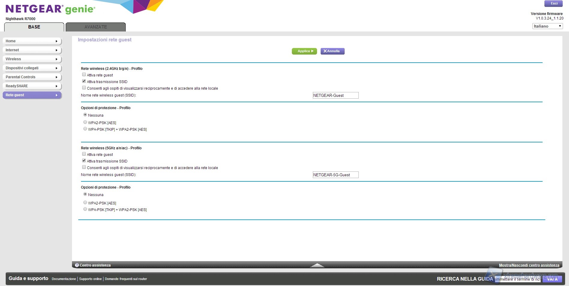 Il Nighthawk R7000 è dotato come tutti i router e modem di Netgear del menù Rete Guest che ci permetterà di gestire come avveniva per il menù di configurazione Wireless la chiave ci cifratura e la funzionalità di isolamento o meno del segnale wireless per entrambe le bande wireless disponibili e quindi magari utilizzarne soltanto una.