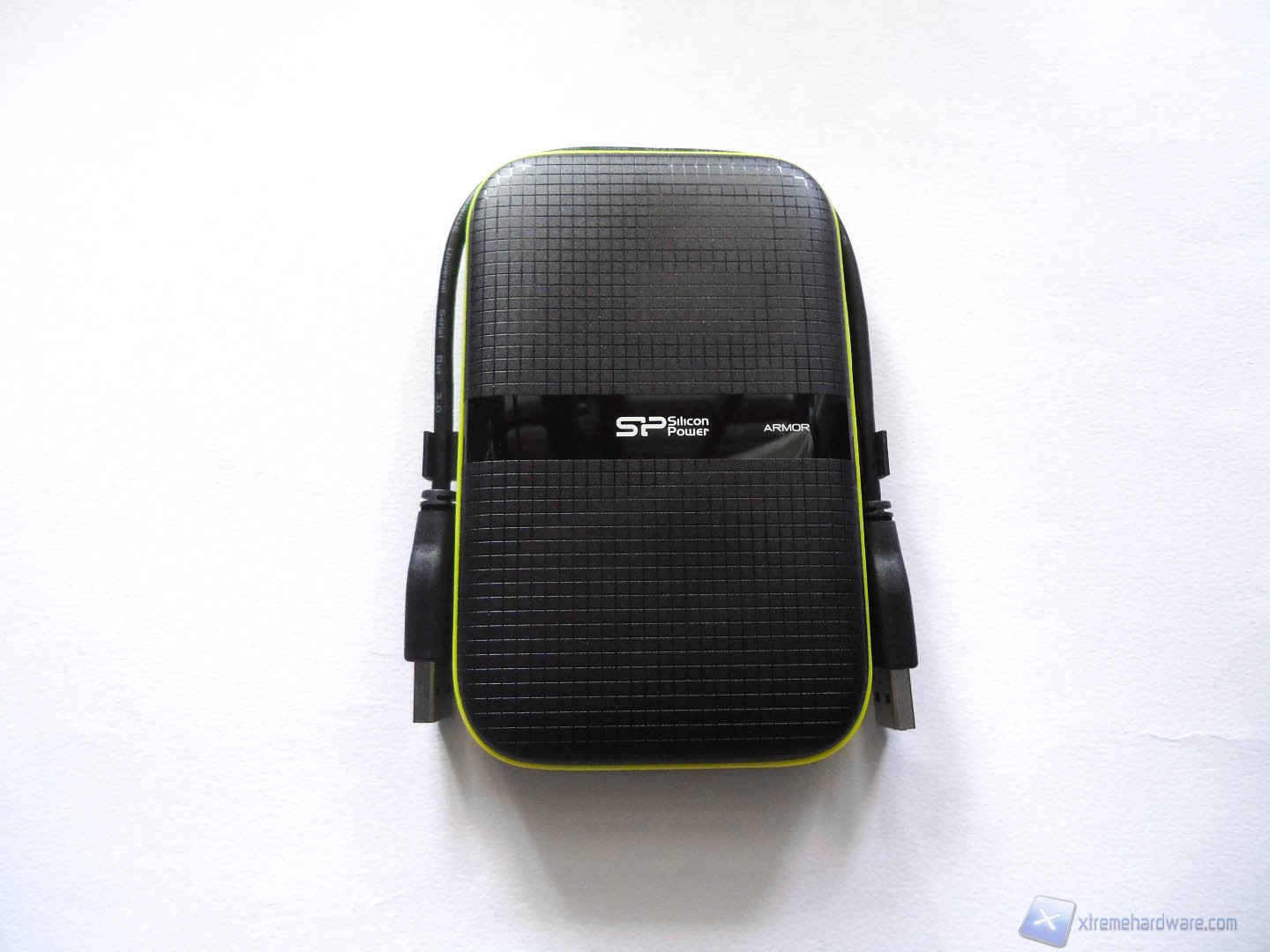 Togliendo dalla scatola in plastica il nostro prodotto, avvertiamo immediatamente l’elevato peso del device e il senso di robustezza che ci trasmette al tatto. Sulla parte frontale troviamo una texture a quadretti in colorazione nera mentre nella parte centrale troviamo una striscia in colorazione nera lucida sulla quale sono impressi il logo SP e la dicitura “Armor”. Grazie all’uso di questa texture a quadretti, il frontale dell’Hard Disk è resistente ai graffi.
