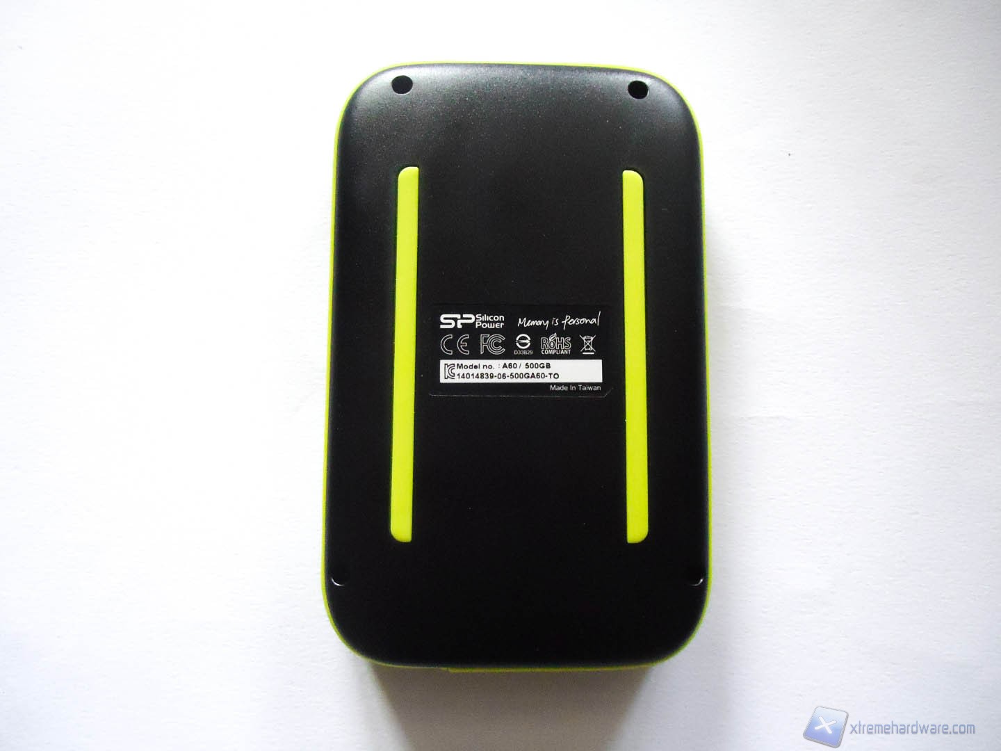 Sul lato posteriore troviamo: i 4 fori per le viti che ci consentono di aprire il box esterno che protegge l’HD, due strisce in gomma che consentono al device di fare presa anche sulle superfici più lisce ed infine al centro è posizionata la targhetta che riporta il modello del prodotto e le varie certificazioni.