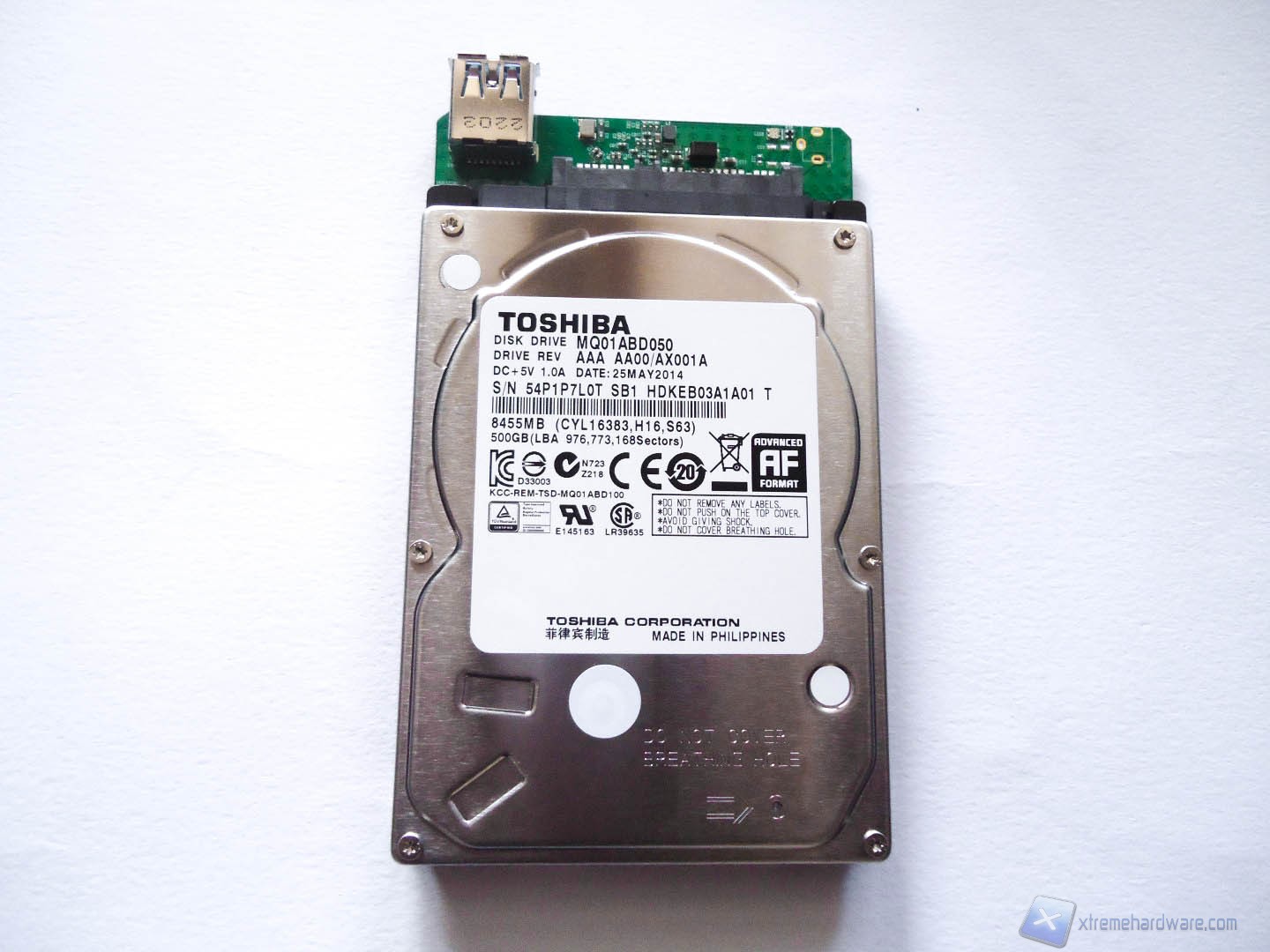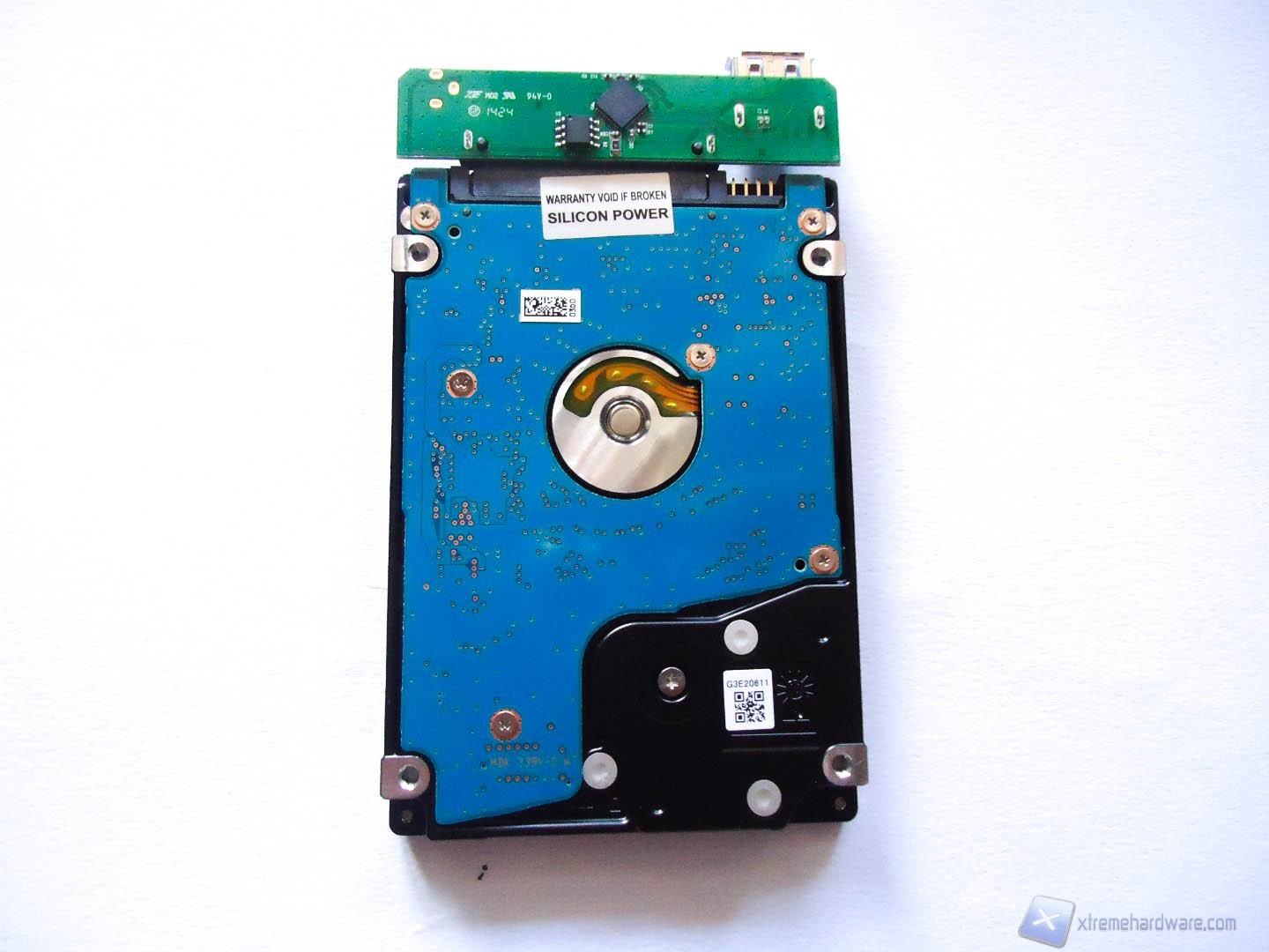 Abbiamo voluto aprire il box esterno dell’HD per farvi vedere quanto sia facile la manutenzione o l’eventuale upgrade dell’HD interno al prodotto. Rimuovendo le 4 viti inferiori possiamo smontare i due coperchi del prodotto che ci rivelano completamente la struttura in gomma e l’HD incastrato nella stessa in modo da mantenerlo al riparo dagl’urti. Una volta rimosso vediamo che l’Hard Disk, un Toshiba MQ01ABD050, è collegato tramite i connettori SATA a un piccolo PCB di colore verde sul quale è saldata la porta USB 3.0. In caso volessimo cambiare HD basterebbe separare lo stesso dal PCB, ma in questo caso la garanzia verrebbe meno.